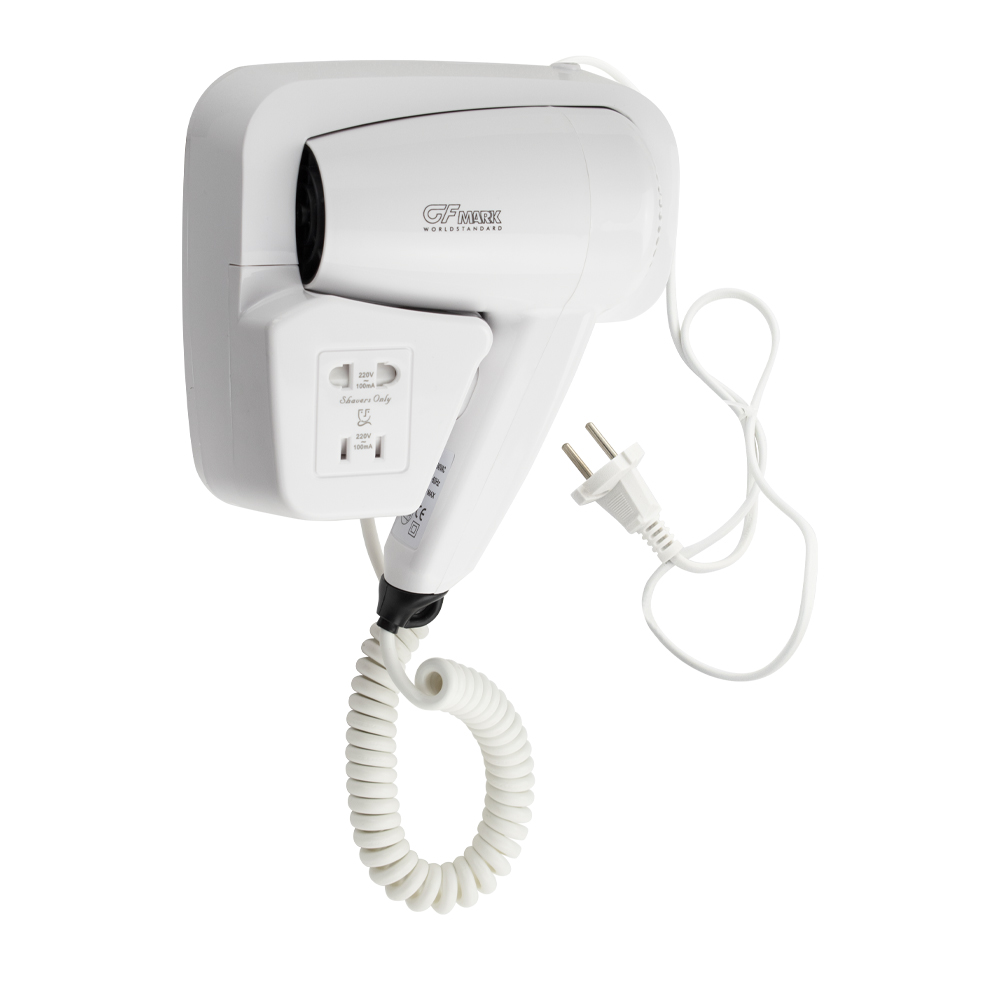 Фен для волос профессиональный, супермощный, в ванную комнату с боковым креплением с розеткой для бритвы, предназначен для сушки волос потоком теплого воздуха. Идеально подходит для установки в гостиницах, бассейнах, фитнес-клубах, в раздевалках складских и производственных комплексов. Так же может использоваться в личных ванных комнатах. Электрический фен позволяет комфортно и быстро высушить волосы после душа. Настенный держатель дает возможность хранить электроприбор в ванной комнате. Материал корпуса выполнен из белого высокопрочного пластика АБС, устойчивого к механическим повреждениям, перепадам температуры и коррозии. Поэтому электроприбор подходит не только для домашнего, но и для общественного использования – бассейны, сауны, душевые в спортивных залах. Благодаря небольшому весу феном удобно пользоваться. Параметры: +65°C, 1200Вт, 220В/50-60Гц, скорость 18 м/с, защита - IPX4. Габаритные размеры: высота блока 165 мм, ширина блока 180 мм, глубина блока 90 мм, высота фена 210 мм, ширина фена 135 мм, диа