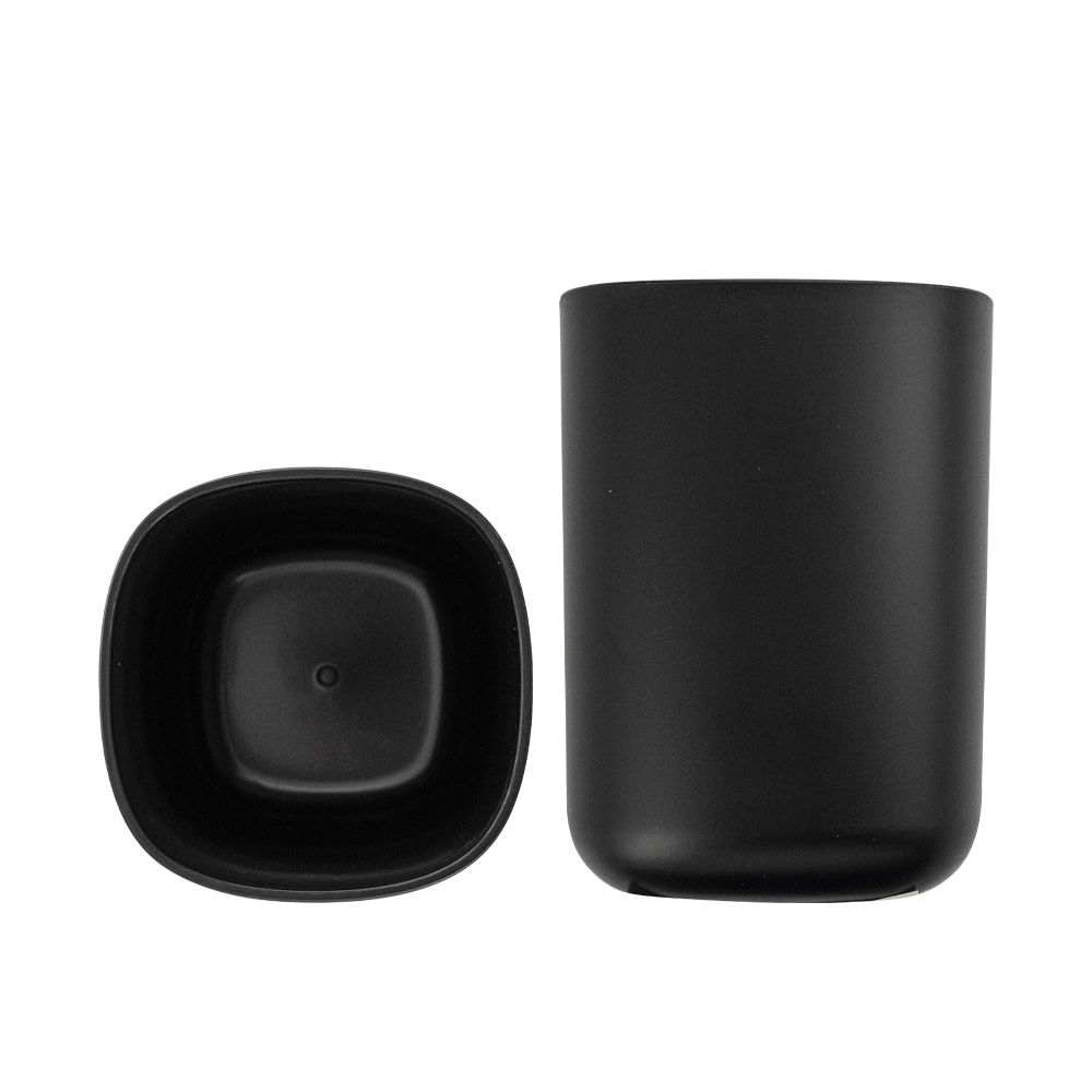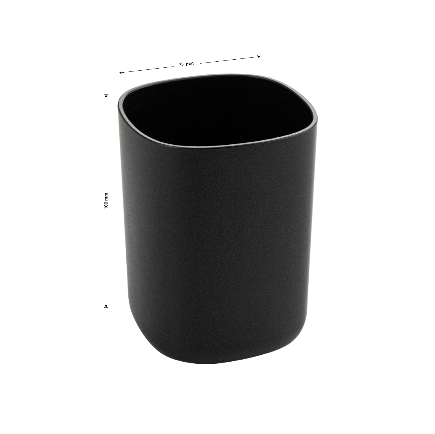 Стакан для зубных щёток и паст настольный — необходимый аксессуар любой ванной комнаты и кухни. Приспособление обеспечит порядок и правильное хранение гигиенических принадлежностей. Изделие выполнено из пластика АБС с чёрным матовым покрытием. Такое сочетание материалов делает конструкцию прочной и долговечной. Гармоничный дизайн и чёрный матовый цвет отлично впишется в любой интерьер. Изделие имеет специальное покрытие, которое защищает его от влаги и придает ему дизайнерский внешний вид. В коллекции представлены: дозатор для мыла, мыльница, напольный ершик для унитаза, стакан для зубных щеток. Габаритные размеры: высота стакана 100 мм, ширина 75 мм, глубина 75 мм. Вес - 0,100 кг, объём - 0,00095 м3