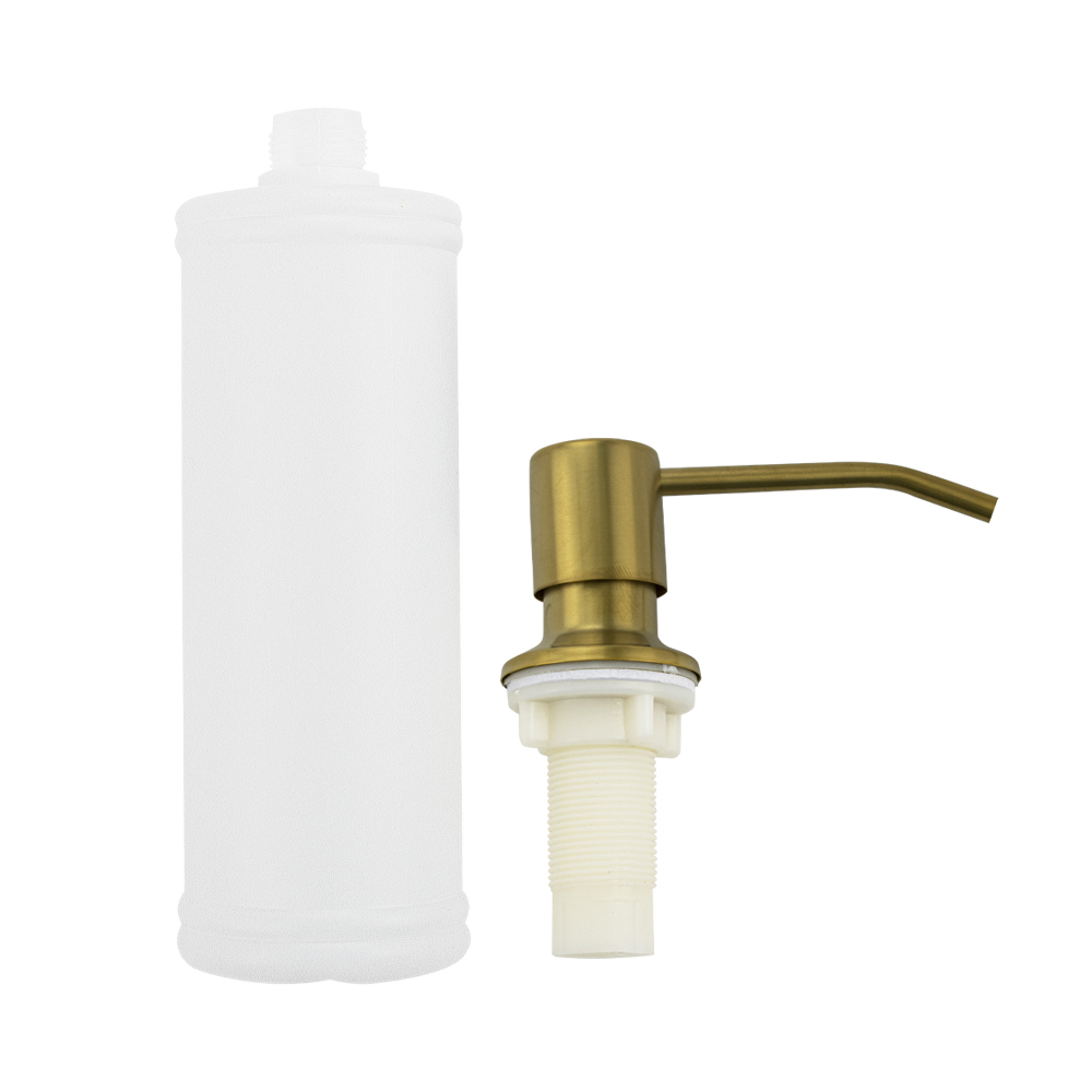Дозатор для жидкого мыла и моющих средств, под золото, врезной, можно установить на кухонную мойку, если в ней предусмотрено место под встраиваемый дозатор, или на столешницу в любом удобном месте. Антивандальный корпус дозатора изготовлен из высокопрочного ABS-пластика и нержавеющей стали. Требуемое отверстие для установки встраиваемого дозатора не менее 25 мм. Это очень удобный и полезный аксессуар на кухне. Наполнять его жидким моющим средством не сложно, нужно просто снять верхнюю часть дозатора и залить требуемое количество жидкого мыла в колбу, емкостью 300 мл. Последовательно нажимая на верхнюю часть дозатора, Вы получаете требуемое количество моющего средства. Габаритные размеры: высота 265 мм, ширина 110 мм, диаметр посадочного седла 40 мм, длины резьбы 65 мм. Вес - 0,150 кг, объем - 0,00150 м3.