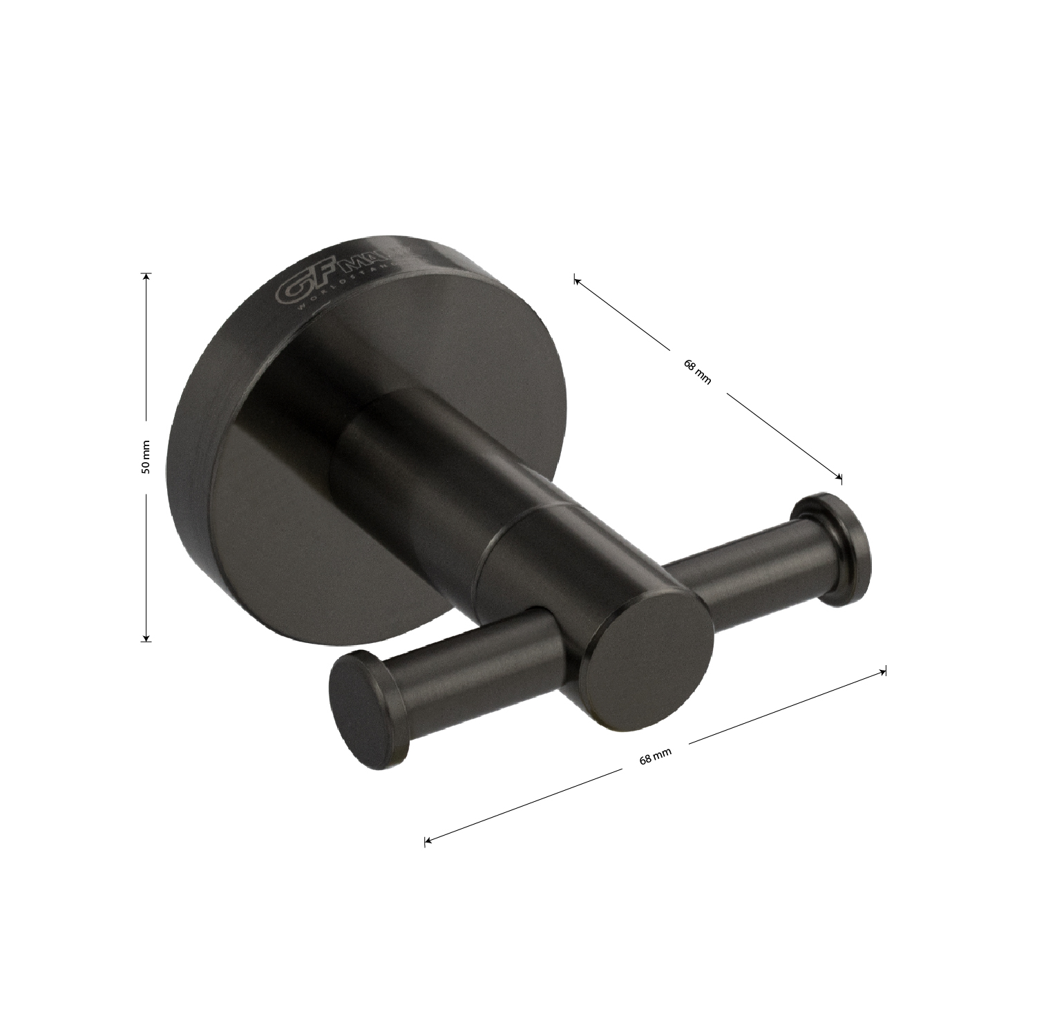 Крючок двойной для полотенец металлический. Материал изготовления — нержавеющая сталь. Имеет специальное матовое покрытие цвета графит, которое защищает изделие от влаги и придает ему безупречный стильный вид и долговечность. На крючке с легкостью можно размещать вещи для сушки или вешать, как полотенца, так и одежду перед походом в душ. Идеально подойдет не только для ванной, но и для кухни, а также для дачи или гаража - при необходимости на держатель можно вешать любые предметы. Изделие крепится к стене с помощью дюбелей и саморезов (входят в комплект). Габаритные размеры: глубина 70 мм, диаметр посадочного седла 50 мм. Вес - 0,200 кг, объём - 0,00050 м3
