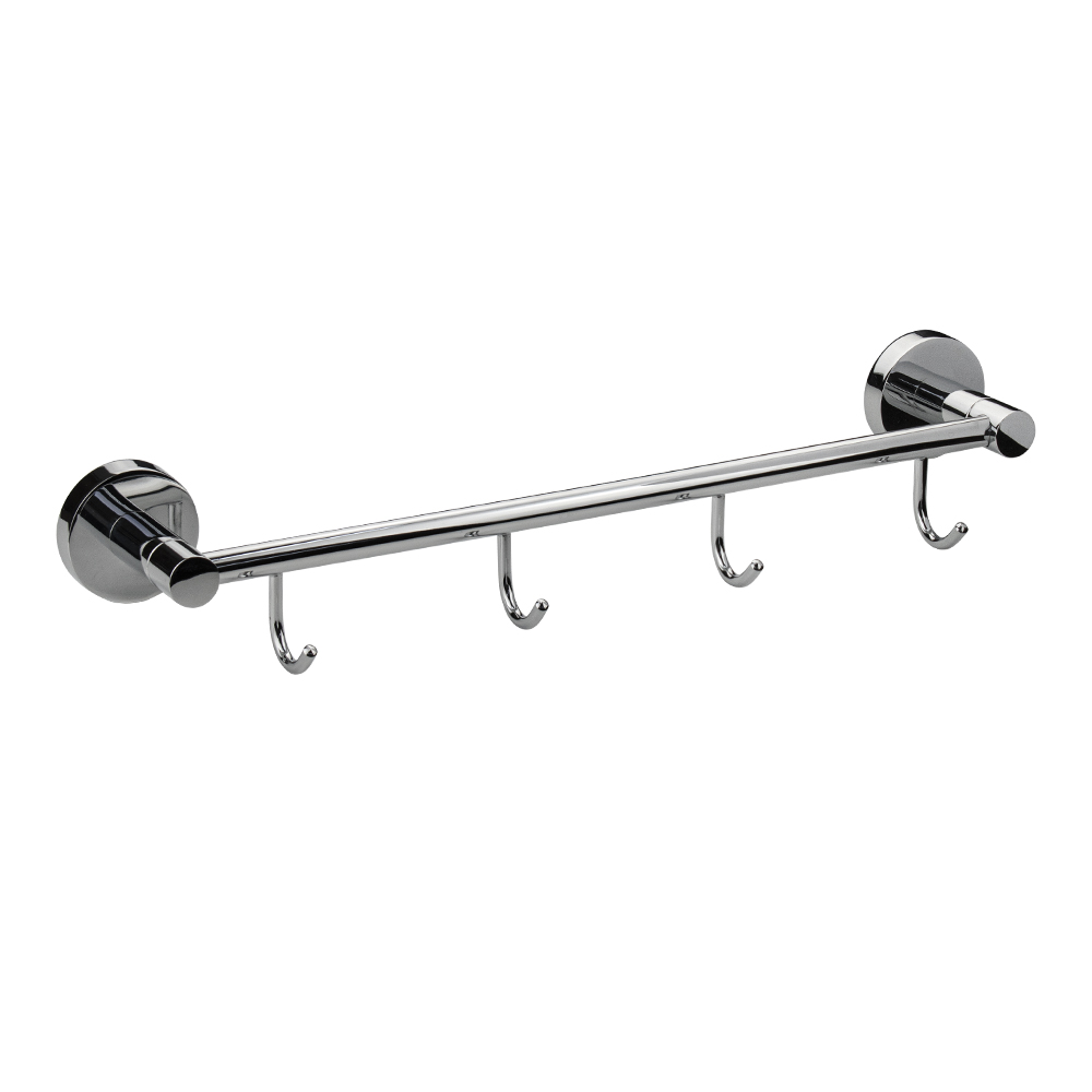 Держатель для полотенец металлический, хромированный, с четырьмя крючками. Материал изготовления — ЦАМ (цинк-алюминий-медь) + нержавеющая сталь. Хромированное покрытие очень стойко переносит истирания и обеспечивает зеркальный блеск изделия. На держателе с легкостью можно размещать вещи для сушки или вешать, как полотенца, так и одежду перед походом в душ. Идеально подойдет не только для ванной, но и для кухни, а также для дачи или гаража - при необходимости на держатель можно вешать любые предметы. Изделие крепится к стене с помощью дюбелей и саморезов (входят в комплект). Габаритные размеры: длина 390 мм, высота 60 мм, глубина 90 мм, диаметр посадочного седла 50 мм. Вес - 0.45 кг, объём - 0.00288 м3.