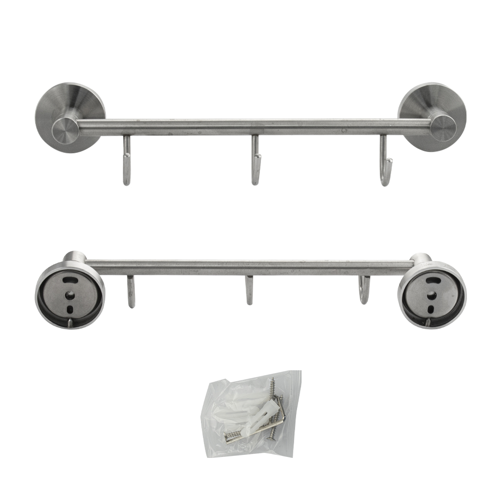 Держатель для полотенец металлический с тремя крючками. Изготовлен из прочной нержавеющей стали марки SUS 304 с матовым покрытием, которое придает безупречный стильный вид и долговечность. На держателе с легкостью можно размещать вещи для сушки или вешать, как полотенца, так и одежду перед походом в душ. Идеально подойдет не только для ванной, но и для кухни, а также для дачи или гаража - при необходимости на держатель можно вешать любые предметы. Изделие крепится к стене с помощью дюбелей и саморезов (входят в комплект). Габаритные размеры: длина 270 мм, высота 85 мм, диаметр посадочного седла 50 мм, длина крючка 40 мм. Вес - 0,400 кг, объём - 0,00241 м3.
