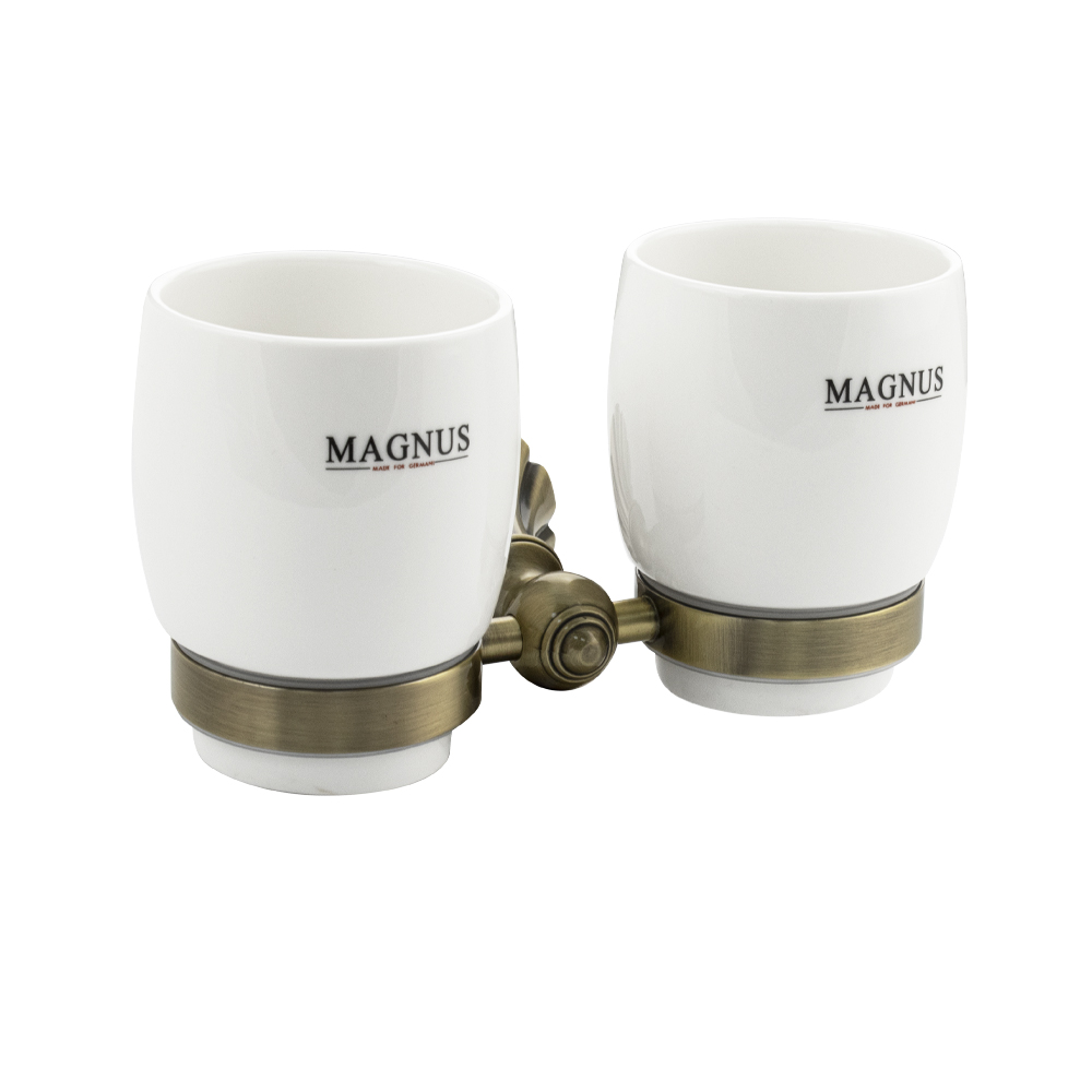 Стакан + стакан керамические с креплением к стене, правильной формы на основании. Изделие выполнено из белой керамики и металла. Материал изготовления — латунь. Бронзовое покрытие очень стойко переносит истирания и обеспечивает стильный вид изделия. Идеально подойдет не только для ванной, но и для кухни. Изделие крепится к стене с помощью дюбелей и саморезов (входят в комплект). Габаритные размеры: высота стакана 95 мм, диаметр 75 мм, ширина 180 мм, основание 65 мм. Вес - 0,900 кг, объём - 0,00297 м3.