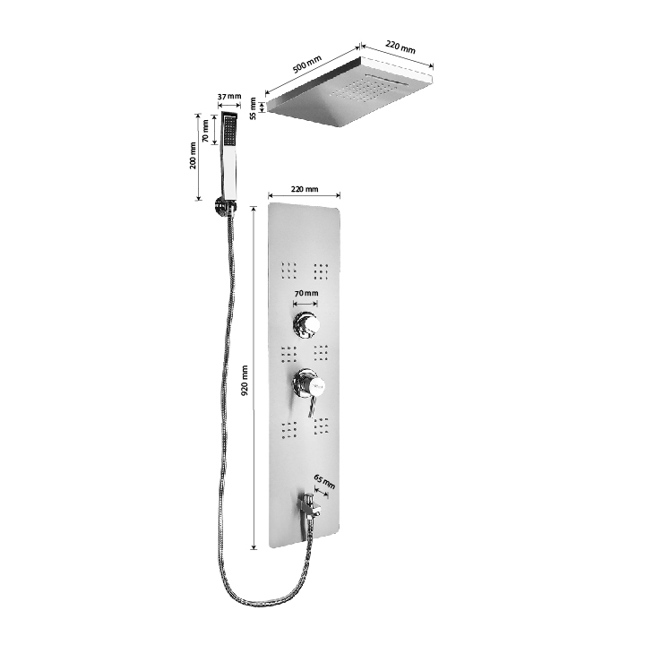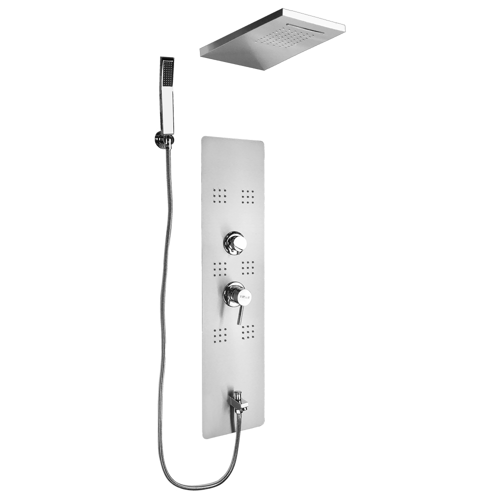 Ультрамодная дизайнерская гидромассажная ВРЕЗНАЯ душевая панель - "тропический душ" с двумя лейками и форсунками, 4 режима работы, с коротким изливом. Функциональность обеспечивают тропический, верхний каскадный душ, ручная лейка и форсунки для массажа спины. Эффектный внешний вид и практичность эксплуатации придает изделию из нержавеющей стали марки 304 матовая хромированная поверхность. Сочетание эстетики и максимального комфорта достигается за счет интегрированных гидромассажных форсунок и встроенного верхнего душа. Стильное и компактное оборудование предназначено для установки в ванну или любую душевую зону. Душевая панель позволит проводить оздоровительные процедуры в домашних условиях, гидромассажные форсунки окажут мягкое терапевтическое воздействие. Габаритные размеры: высота 920 мм, ширина 220 мм, длина верхнего душа 500 мм, длина излива 65 мм, длина шланга 150 см. Вес - 12,000 кг, объём - 0,10400 м3. Комплект: корпус / крепления / лейка / держатель для лейки / душевой шланг / излив / переключатель п