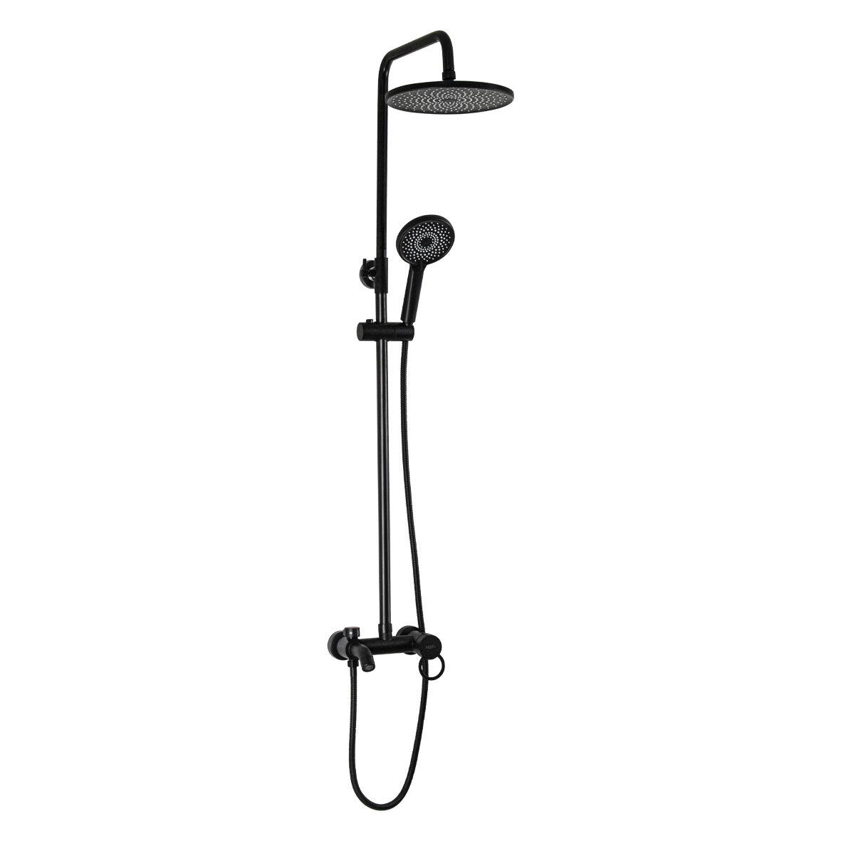 Смеситель + стойка душевая "тропический душ" с двумя лейками в ванную, чёрного цвета. В дизайне душевой стойки гармонично соединились строгие линии и мягкие переходы. Она отлично впишется в интерьер ванной комнаты в минималистическом стиле. Матовое покрытие чёрного цвета не стирается и сохраняет первозданный внешний вид в течение всего периода эксплуатации. Длительную работу без протечек обеспечивает смеситель с керамическим картриджем. Предусмотрен излив для наполнения ванны. Угол наклона верхнего душа можно регулировать в соответствии с потребностями каждого пользователя. Ручная лейка оснащена металлическим шлангом, который не перекручивается во время водных процедур. Смеситель шаровый с коротким изливом, душевым шлангом и лейкой и дивертор переключения в трёх положениях. Картридж d = 35 мм, ручка с кольцом, аэратор для экономии воды, чашки и эксцентрики. Душевая стойка с присоединением к корпусу смесителя и дополнительным креплением к стене и большой круглой лейкой с эффектом тропического душа. Габаритные