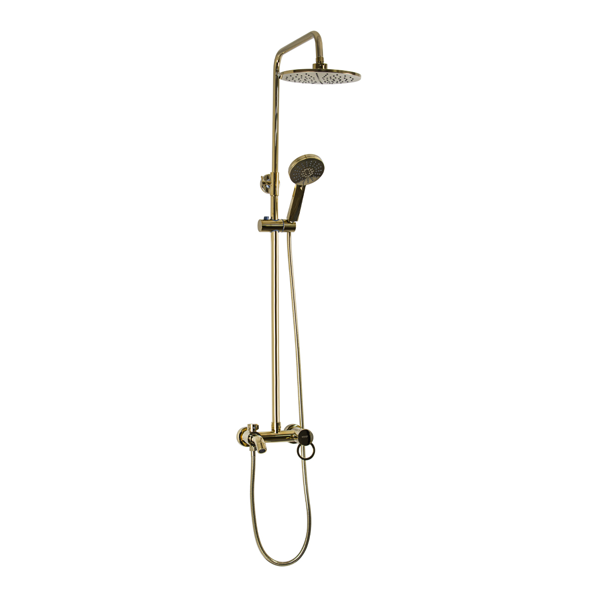 Смеситель + стойка душевая "тропический душ" с двумя лейками в ванную, цвет под золото. В дизайне душевой стойки гармонично соединились строгие линии и мягкие переходы. Она отлично впишется в интерьер ванной комнаты в минималистическом стиле. Глянцевое покрытие под состаренную бронзу не стирается и сохраняет первозданный внешний вид в течение всего периода эксплуатации. Длительную работу без протечек обеспечивает смеситель с керамическим картриджем. Предусмотрен излив для наполнения ванны. Угол наклона верхнего душа можно регулировать в соответствии с потребностями каждого пользователя. Ручная лейка оснащена металлическим шлангом, который не перекручивается во время водных процедур. Смеситель шаровый с коротким изливом, душевым шлангом и лейкой и дивертор переключения в трёх положениях. Картридж d = 35 мм, ручка с кольцом, аэратор для экономии воды, чашки и эксцентрики. Душевая стойка с присоединением к корпусу смесителя и дополнительным креплением к стене и большой круглой лейкой с эффектом тропического душа