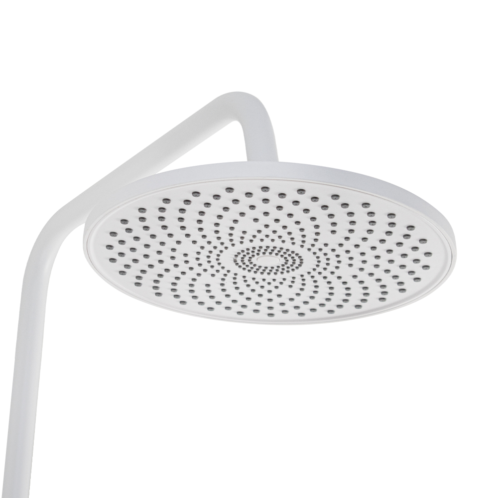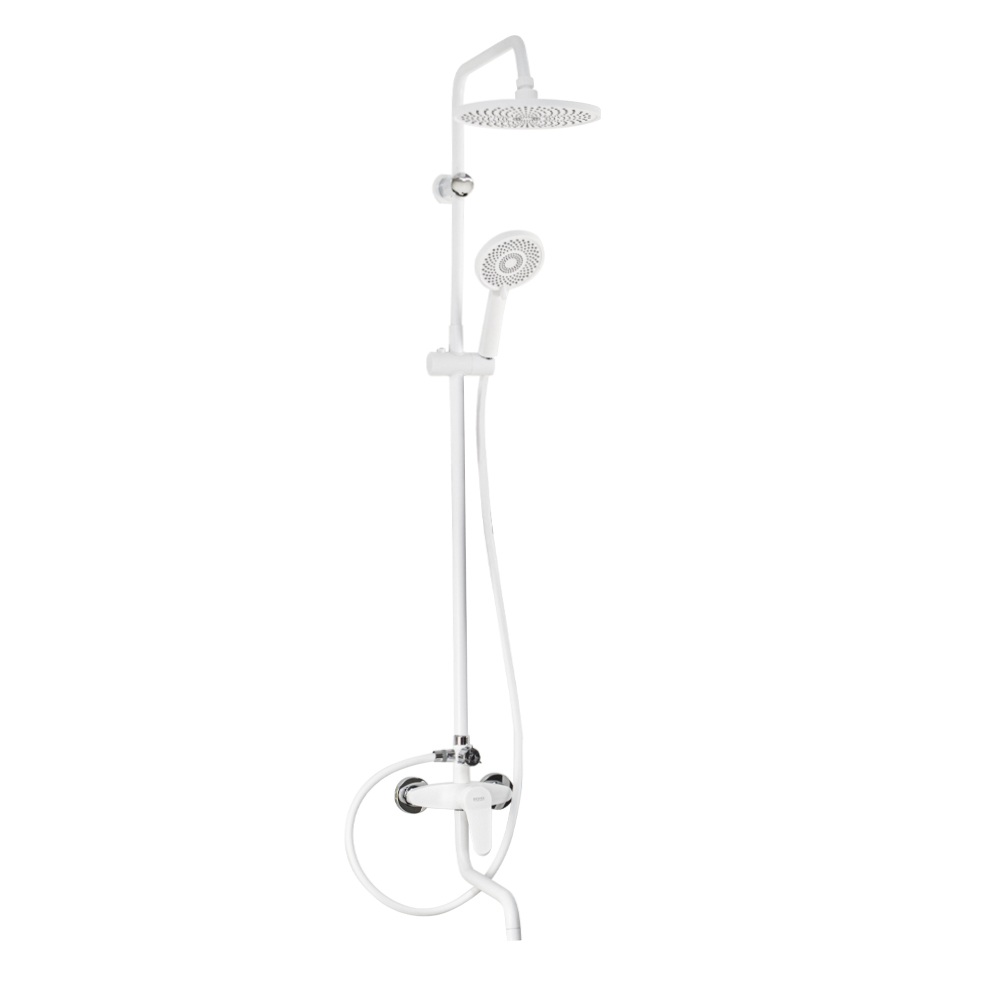 Смеситель + стойка душевая телескопическая "тропический душ" с двумя лейками в ванную / душевую комнату, белая. Смеситель шаровый, пластик АБС с поворотным круглым длинным изливом, душевым шлангом и лейкой и дивертор переключения в трёх положениях. Картридж d = мм, ручка литая, аэратор для экономии воды, чашки и эксцентрики. Душевая, регулируемая по высоте стойка с присоединением к корпусу смесителя и дополнительным креплением к стене и крючками для принадлежностей и большой круглой лейкой с эффектом тропического душа. Габаритные размеры: ширина смесителя 150 мм, высота 270 мм, длина излива корпуса 270 мм, высота телескопической стойки 800-1100n мм, длина излива стойки 330 мм, круглая душевая лейка d = 120 мм, круглая лейка тропический душ d = 230 мм, шланг 150 см. Вес - 3,070 кг, объём - 0,029 м3. В комплекте корпус с изливом, чашки, эксцентрики, прокладки, стойка, дивертор, шланг, две лейки, крепления.