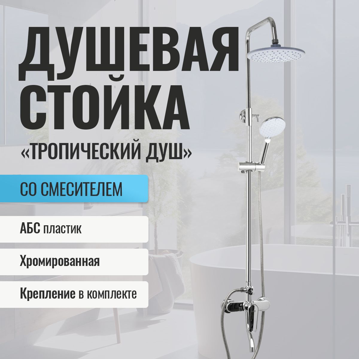 Смеситель + стойка душевая "тропический душ" с двумя лейками в ванную, хромированные. В дизайне душевой стойки гармонично соединились строгие линии и мягкие переходы. Она отлично впишется в интерьер ванной комнаты в минималистичном стиле. Глянцевое хромированное покрытие не стирается и сохраняет первозданный внешний вид в течение всего периода эксплуатации. Длительную работу без протечек обеспечивает смеситель с керамическим картриджем. Предусмотрен поворотный излив для наполнения ванны. Угол наклона верхнего душа можно регулировать в соответствии с потребностями каждого пользователя. Ручная лейка оснащена металлическим шлангом, который не перекручивается во время водных процедур. Смеситель шаровый с коротким поворотным изливом, душевым шлангом и лейкой и дивертор переключения в трёх положениях. Картридж d = 35 мм, ручка литая, аэратор для экономии воды, чашки и эксцентрики. Душевая стойка с присоединением к корпусу смесителя и дополнительным креплением к стене и большой круглой лейкой с эффектом тропического