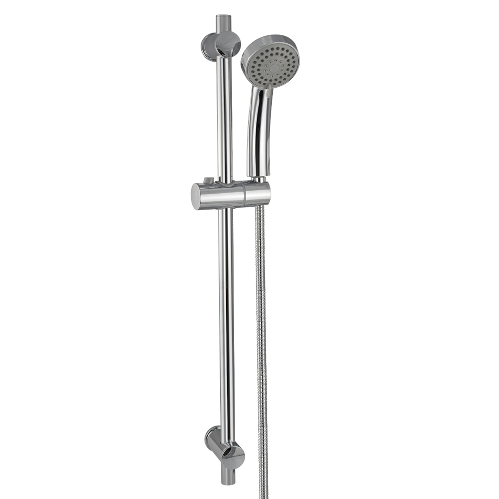 Душевая стойка с шлангом, душевой лейкой 3 режима, хромированная, произведена из нержавеющей стали и высокопрочного пластика АБС, устойчивой к агрессивному воздействию внешней среды и механическим деформациям. Хромированная поверхность не подвержена механическим повреждениям, а ее глянцевый блеск будет радовать в течение всего срока службы. Держатель для душа с механической фиксацией и регулировкой по высоте. Ручная лейка круглой формы предполагает   использование трех режимов струй. Благодаря инновационной технологии Air Power вода смешивается с воздухом, приобретая мягкость и объем, а ее расход снижается. Душ оснащен специальными силиконовыми форсунками, через которые мгновенно удаляются любые частицы. А образованию известковых отложений внутри изделия препятствует особый защитный слой. Расстояние между настенными креплениями регулируется, что позволяет использовать в процессе монтажа отверстия, имеющиеся в стене. Размеры: высота штанги 700 мм, диаметр трубы 21 мм, диаметр основания крепления 42 мм, длина л