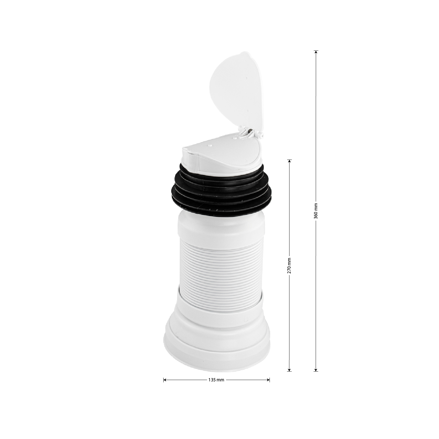 Фановая гофрированная труба, армированная,с обратным клапаном, используется в процессе подсоединения унитаза к канализационной системе. Деталь изготовлена из высококачественного пластика, который не разрушается под воздействием агрессивных химических средств и не страдает от механических повреждений, армированная нить хорошо держит форму, соединение через манжету без герметика, надежность, быстрота и удобство монтажа. Она оснащена прочной уплотнительной прокладкой, выполненной из эластомера. Последняя обеспечивает герметичность соединения. Изделие может использоваться со всеми унитазами, обладающими горизонтальным или косым выпуском. Габариты и параметры: высота 360 мм, диаметр входа равен 135 мм, выхода 95 мм. Вес -  0,460 кг, объём - 0,011 м3.