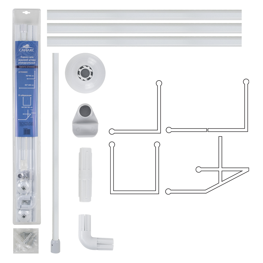 Карниз в ванную угловой, белый. Универсальный, П и Г - образная система, изготовлена из алюминиевых трубок и пластиковых составных креплений. Изделие в собранном виде имеет усиленную (диаметр 25 мм) конструкцию размером 90 x 90 x 90 см, которая поддерживает/направляет шторку и позволяет прикрывать с трёх сторон место приёма водных процедур. Купить штангу можно как для установки над душевым поддоном, так и для того, чтобы ограничить распространение брызг при пользовании лейкой в классической ванной. Быстро и легко устанавливается. Полный комплект для установки с дюбелями с шурупами. Такой вид конструкции позволяет использовать его в любом помещении. Вес - 0.700 кг, объём - 0.00650 м3.