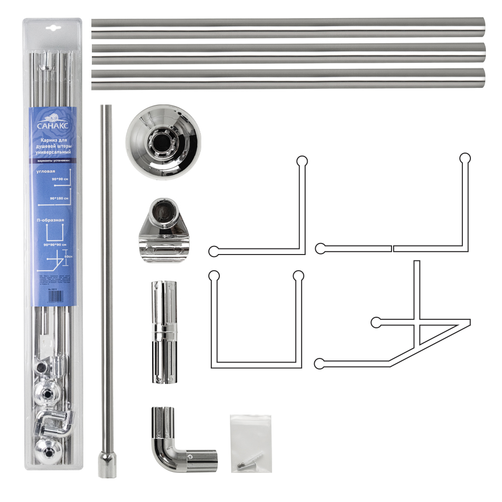 Карниз в ванную угловой, хромированный. Универсальный, П и Г - образная система, изготовлена из нержавеющей стали, трубок и пластиковых составных креплений. Изделие в собранном виде имеет усиленную (диаметр 25 мм) конструкцию размером 90x90x90 см, которая поддерживает/направляет шторку и позволяет прикрывать с трёх сторон место приёма водных процедур. Купить штангу можно как для установки над душевым поддоном, так и для того, чтобы ограничить распространение брызг при пользовании лейкой в классической ванной. Быстро и легко устанавливается. Полный комплект для установки с дюбелями с шурупами. Такой вид конструкции позволяет использовать его в любом помещении. Вес - 0.700 кг, объём - 0.00650 м3.