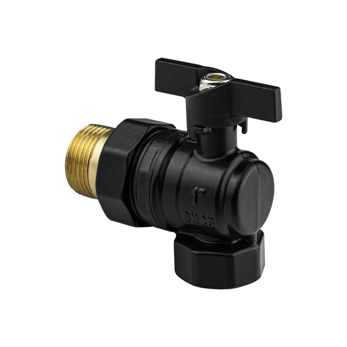 Кран шаровой, угловой, с "американкой " 1", ручка "бабочка", цвет черный. Выдерживают номинальное давление до 1,6 МПа, изготавливаются из высокопрочных марок латуни. Габаритные размеры: высота 90 мм, ширина 100 мм. Вес - 0,600 кг, объем - 0,00096 м3.