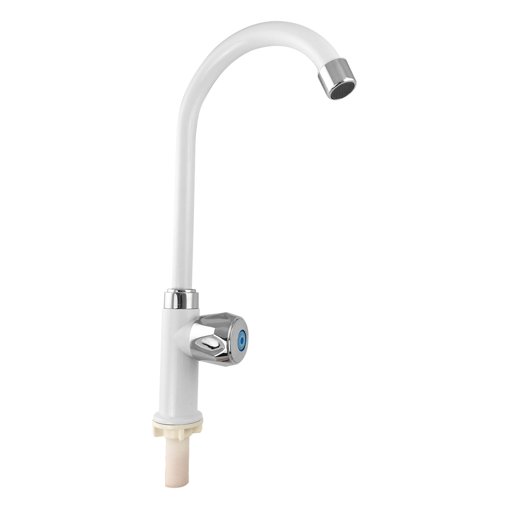 Кран на одну воду, из высокопрочного пластика АБС, белый, с хромированным аэратором для экономии воды, с высоким изливом. Крепление резьба - гайка. Кранбукса м/к, хромированная круглая ручка, поворот на 90˚. Габаритные размеры: высота 325 мм, длина 175 мм, диаметр посадочного седла 45 мм, длина резьбы 55 мм. Вес - 0,250 кг, объём - 0,00143 м3. В комплекте корпус, паспорт, крепёж.