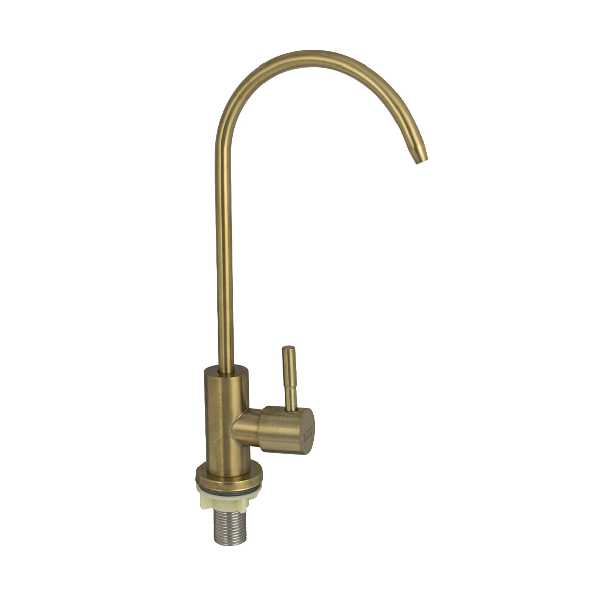 Кран на одну воду для питьевой воды с тонким изливом, для подключения фильтра тонкой очистки, матовый литой корпус под золото , из нержавеющей стали марки 201. Крепление резьба - гайка, подключение к водопроводной сети с помощью гибких шлангов с накидной гайкой на 1/2. Кранбукса м/к, ручка шток, поворот на 90˚. Такая модель может использоваться на домашней кухне, на даче, в медицинских учреждениях и общественных местах. Габаритные размеры:высота 250 мм, длина 135 мм, диаметр посадочного седла 40 мм, длина резьбы 45 мм. Вес - 0,33 кг, объём - 0,0033 м3. В комплекте корпус с изливом, крепёж.