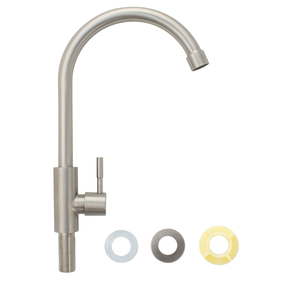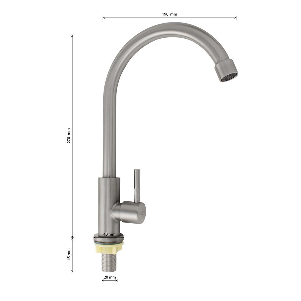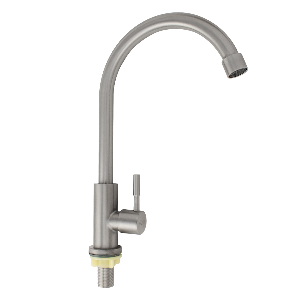 Кран на одну воду для кухонной мойки и раковин, матовый корпус, из нержавеющей стали марки 304, с высоким С-образным изливом, с аэратором для экономии воды. Крепление резьба - гайка, подключение к водопроводной сети с помощью гибких шлангов с накидной гайкой на 1/2. Кранбукса м/к, ручка шток, поворот на 90˚. Такая модель может использоваться на домашней кухне, на даче, в медицинских учреждениях и общественных местах. Габаритные размеры: высота 270 мм, длина 190 мм, диаметр посадочного седла 40 мм, длина резьбы 45 мм. Вес - 0,800 кг, объём - 0,00435 м3. В комплекте корпус с изливом, крепёж.