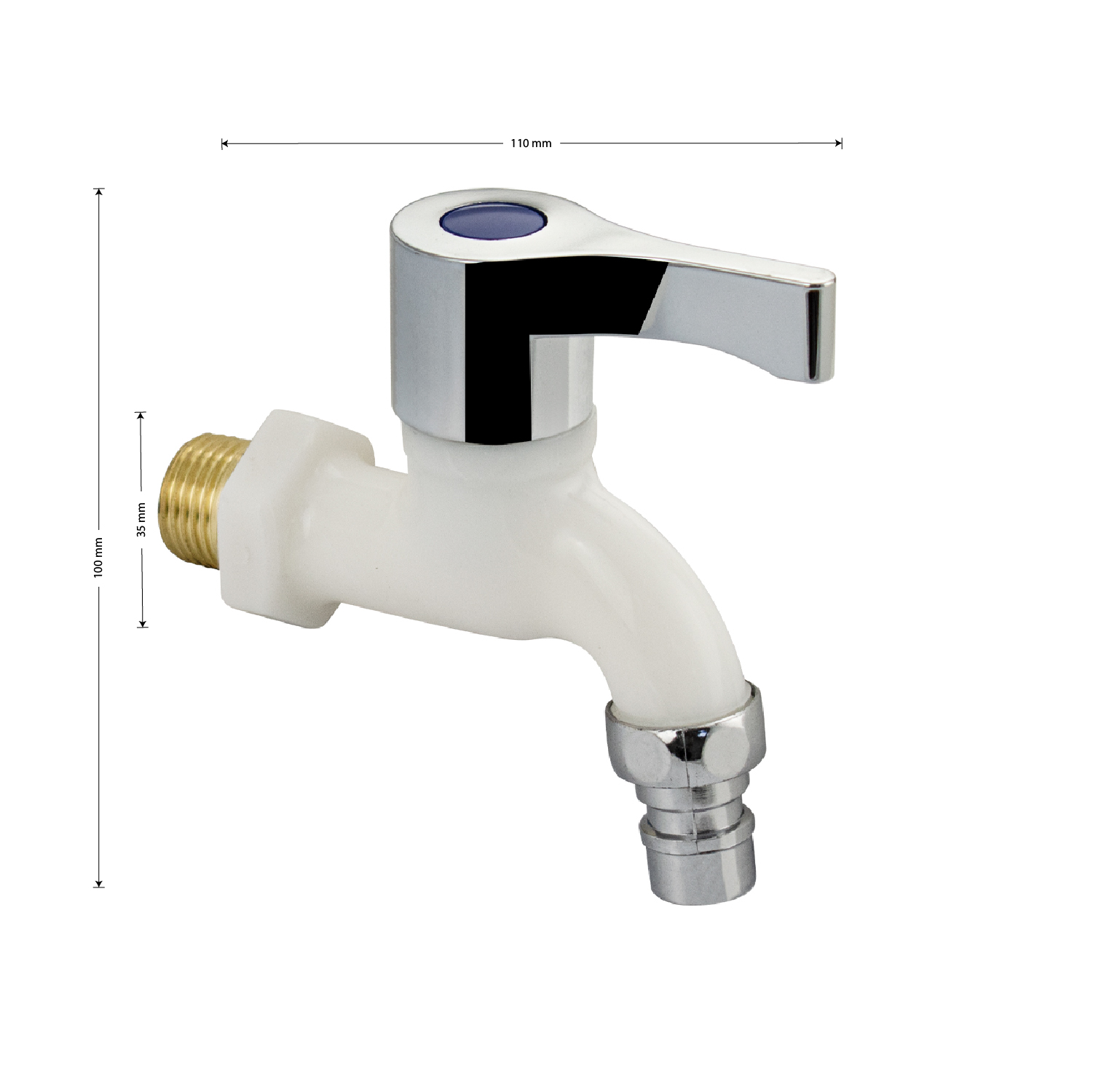 Кран водоразборный 1/2 из пластика АБС, ручка флажок, с латунной резьбой. Габаритные размеры: высота 100 мм, ширина 110 мм, диаметр посадочного седла 35 мм. Вес - 0,11 кг, объем 0,00044 м3.