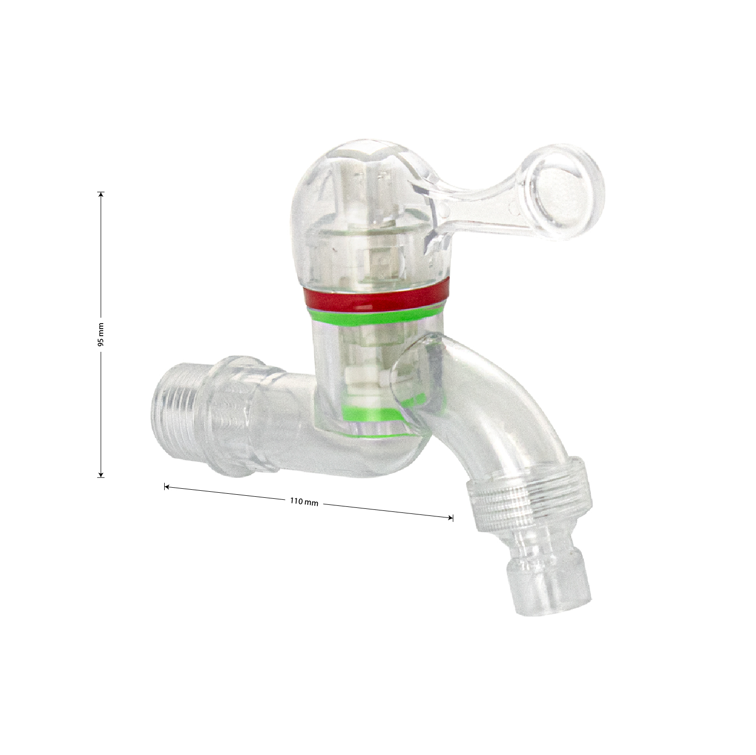 Кран водоразборный 1/2н, из высокопрочного пластика АБС, прозрачный, со штуцером, с возможностью подсоединения поливочного шланга, металлокерамика, круглая ручка. Габаритные размеры: высота 105 мм, длина 90 мм от стены. Вес - 0,030 кг, объём - 0,00050 м3.