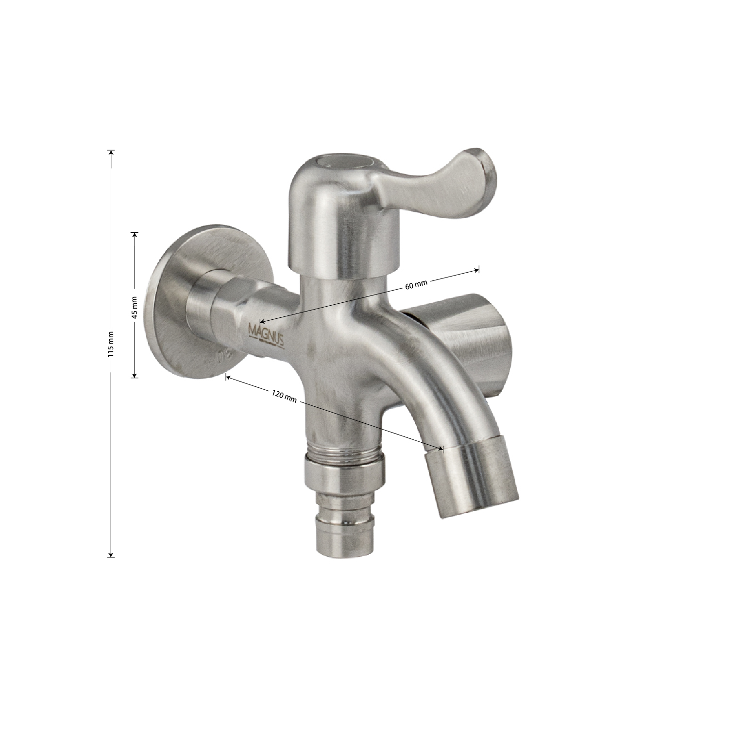 Кран водоразборный на 1/2", наружняя резьба, из нержавеющей стали марки SUS 304, с двойным выходом, металлокерамика, ручка флажок поворот на 90˚. Такая модель может использоваться на домашней кухне, на даче, в медицинских учреждениях и общественных местах. Габаритные размеры: высота 115 мм, длина 120 мм, диаметр посадочного седла 45 мм. Вес - 0,45 кг, объём - 0,00128 м3.