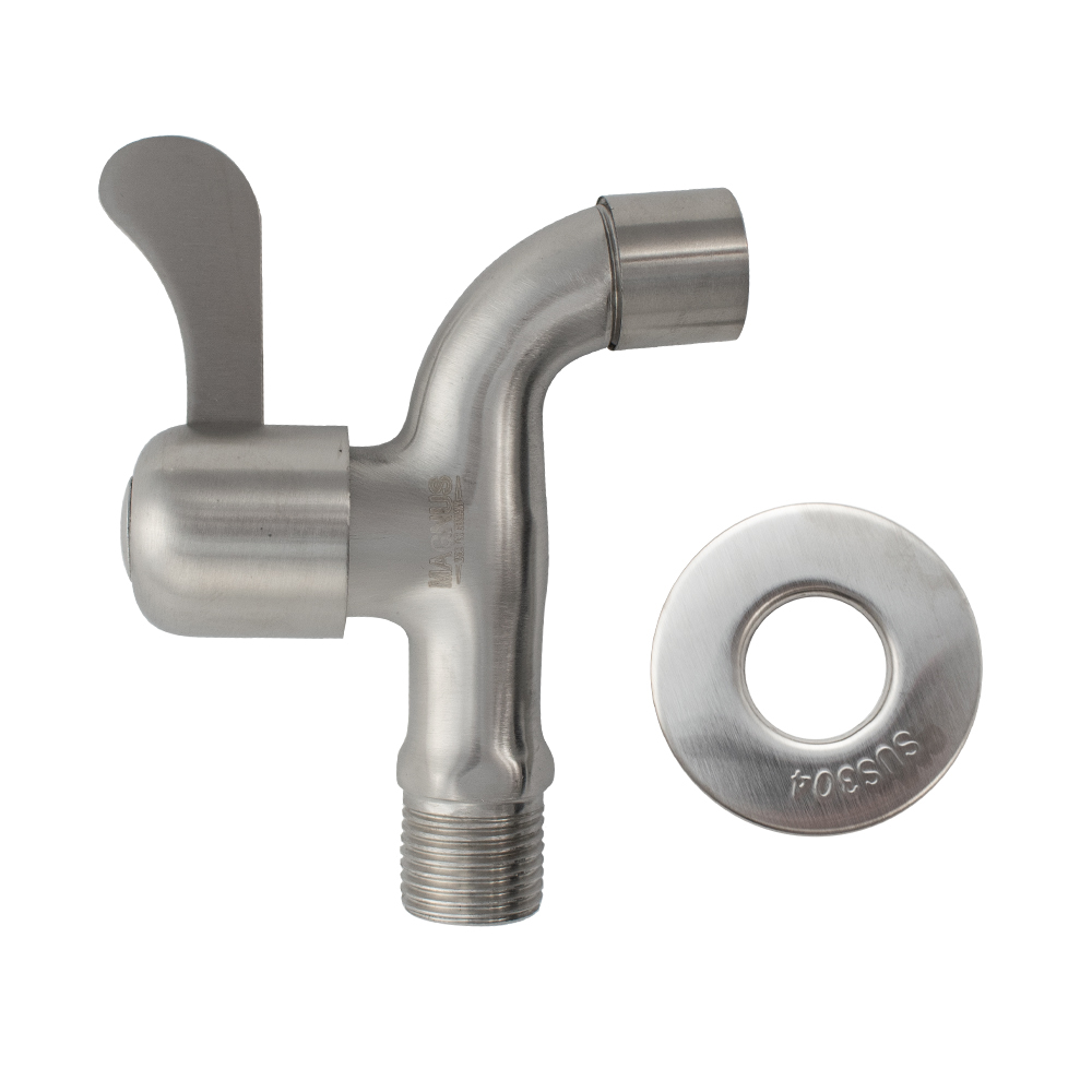 Кран водоразборный на 1/2", от стены 10 см, наружняя резьба, матовый корпус, из нержавеющей стали марки 304, с аэратором для смягчения потока, металлокерамика, ручка флажок поворот на 90˚. Такая модель может использоваться на домашней кухне, на даче, в медицинских учреждениях и общественных местах. Габаритные размеры: высота 95 мм, длина 90 мм. Вес - 0,200 кг, объём - 0,00043 м3.