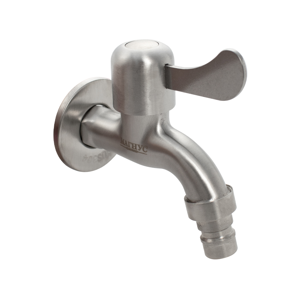 Кран водоразборный на 1/2", от стены 10 см, наружняя резьба, матовый корпус из нержавеющей стали марки 304, со штуцером для подключения поливочного шланга, металлокерамика, ручка флажок поворот на 90˚. Такая модель может использоваться на домашней кухне, на даче, в медицинских учреждениях и общественных местах. Габаритные размеры: высота 95 мм, длина 90 мм. Вес - 0,250 кг, объём - 0,00043 м3.