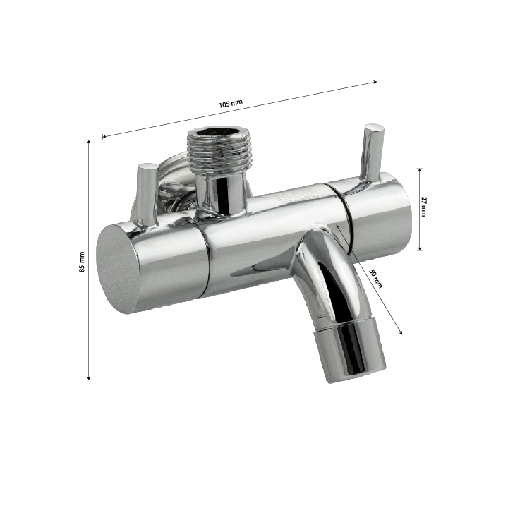 Кран водоразборный, универсальный с гусаком и с выходом под биде или душевую лейку, металлокерамика 1/2, хромированный. Габаритные размеры: высота 85 мм, ширина 105 мм, длина излива 50 мм. Вес - 0,400 кг, объём - 0,00110 м3. Габаритные размеры коробки: ширина 120 мм, высота 77 мм, глубина 90 мм.