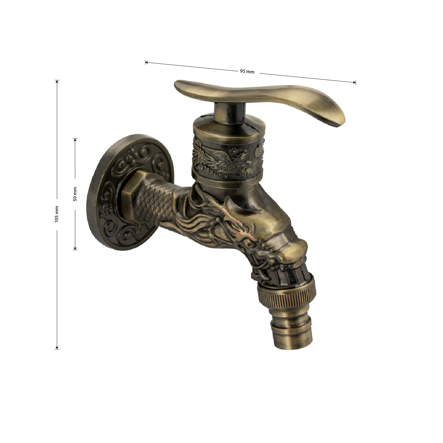 Кран водоразборный на 1/2", от стены 10 см, наружняя резьба, латунный корпус под бронзу, со штуцером для подключения поливочного шланга, металлокерамика, ручка флажок поворот на 90˚. Такая модель может использоваться на домашней кухне, на даче, в медицинских учреждениях и общественных местах. Габаритные размеры: высота 150 мм, длина 95 мм, диаметр посадочного седла 50 мм. Вес - 0,300 кг, объём - 0,00062 м3.