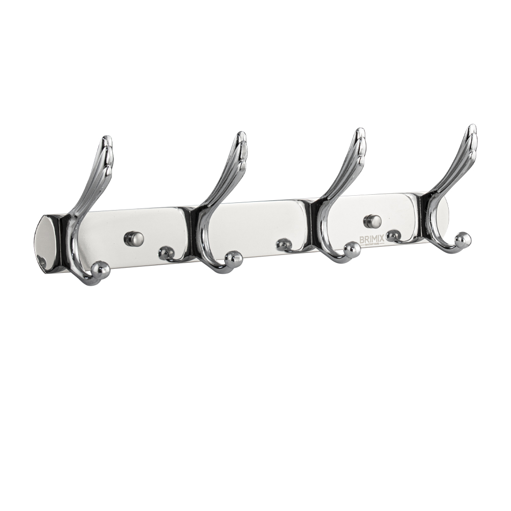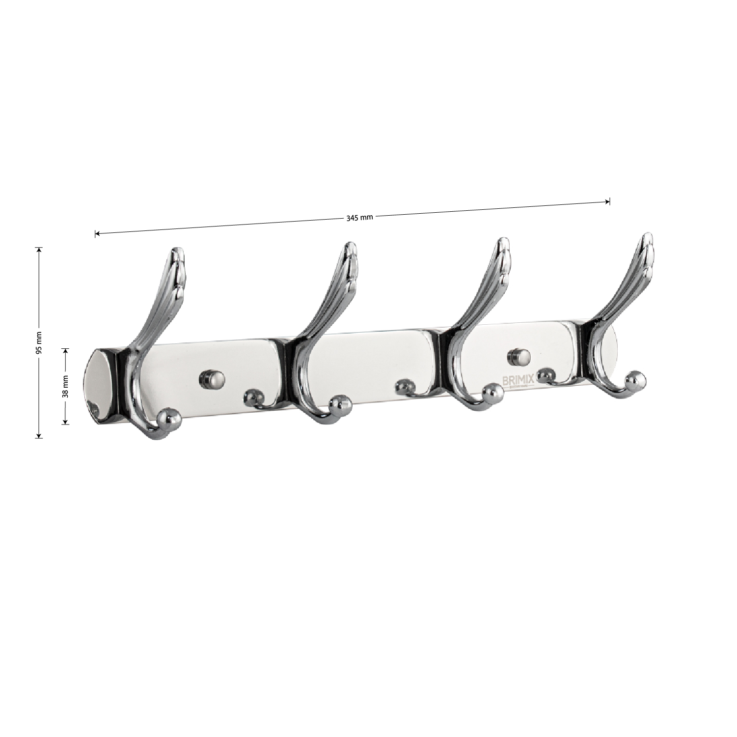Вешалка - держатель для принадлежностей, металлический, хромированный, с четырьмя двойными крючками. Изготовлен из прочной нержавеющей стали марки SUS 304 с хромированным покрытием, которое придает безупречный стильный вид и долговечность. Хромированное покрытие очень стойко переносит истирания и обеспечивает зеркальный блеск изделия. На держателе с легкостью можно размещать вещи для сушки или вешать, как полотенца, так и одежду перед походом в душ. Идеально подойдет не только для ванной, но и для кухни, а также для дачи или гаража - при необходимости на держатель можно вешать любые предметы. Изделие крепится к стене с помощью дюбелей и саморезов (входят в комплект). Габаритные размеры: длина 345 мм, высота 95 мм, глубина 55 мм. Вес - 0,400 кг, объём - 0,00133 м3.