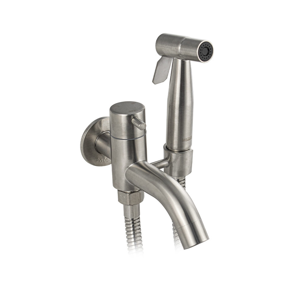 Кран водоразборный с гигиеническим душем, из нержавеющей стали марки SUS 304, матовый, от торговой марки MAGNUS – удобное и безопасное устройство для проведения гигиенических процедур. Лейка изготовлена из прочного материала, обеспечивающего великолепные эксплуатационные свойства изделия. Подача воды осуществляется нажатием клавиши управления. Матовое покрытие придает модели изящный внешний вид и позволяет легко вписать в современный интерьер ванной и туалетной комнаты. Габаритные размеры: высота 110 мм, ширина 145 мм, диаметр посадочного седла 47 мм, длина шланга 150 см. Вес - 0.73 кг, объём - 0.002 м3. В комплекте лейка, шланг, угловой двойной кран м/к 1/2, кронштейн, комплект креплений.