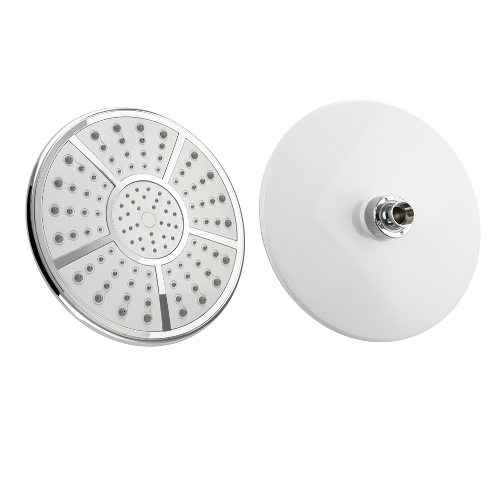 Душевая лейка тропический душ круглая с белой вставкой, отличается современным технологичным дизайном, высокой надежностью, долговечностью. Она изготовлена из влагостойкого пластика АБС и имеет декоративное покрытие цвета «хром», придающее устройству привлекательный вид и предохраняющее от агрессивного воздействия окружающей среды. Корпус отличается небольшим весом, что исключает повреждение напольной плитки или эмали ванны при случайном падении. Лейка крепится к штанге при помощи шарнирного соединителя, внутрь которого встроен сетчатый аэратор для равномерного распределения воды. Также шарнирный соединитель позволяет менять угол наклона душевой насадки от 0° до 22°. Конструкция душа создает эффект тропического ливня, делая водные процедуры приятными и комфортными. Ухаживать за душевой лейкой легко. Глянцевую поверхность достаточно протереть мягкой салфеткой, она в течение долгого времени не потеряет своего блеска. Система помогает мгновенно очистить силиконовые форсунки душевой лейки от известкового налета и