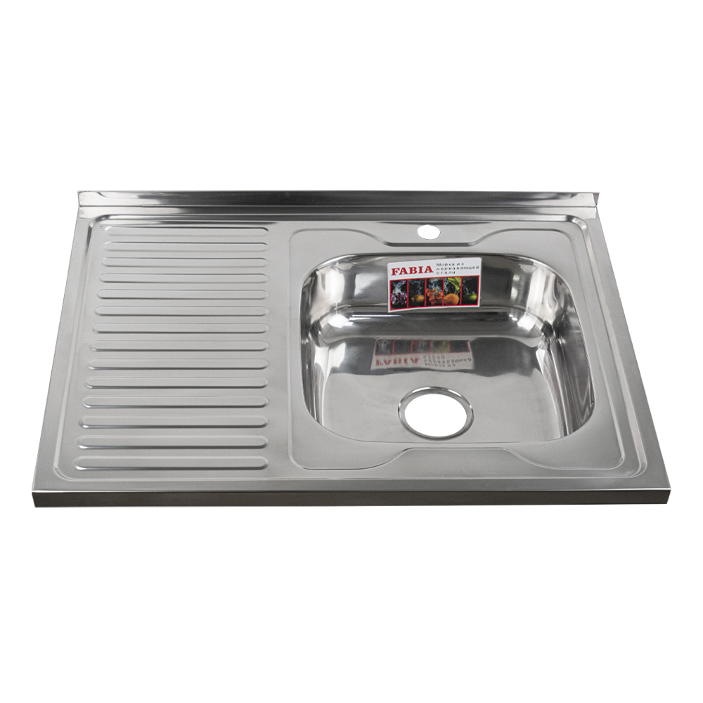 Накладная мойка FABIA из нержавеющей стали отличный вариант для кухни, она прослужит многие годы. Классическая форма и хромированный цвет гармонично впишутся в любой интерьер и никогда не выйдут из моды. Оптимальный размер с площадкой для посуды позволяет свободно мыть посуду, без страха её разбить. Мойка  устанавливается на тумбочку. Практичная площадка, расположенная по центру, даёт возможность вмонтировать любую понравившуюся модель смесителя. В комплекте сифон с большой горловиной с переливом. Габаритные размеры: ширина 800 мм, длина 600 мм, глубина 160 мм, толщина стали 0,6 мм. Вес - 3,400 кг, объём - 0,02593 м3.