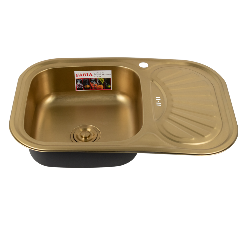 Врезная мойка FABIA из нержавеющей стали отличный вариант для кухни, она прослужит многие годы. Классическая форма и цвет под золото гармонично впишутся в любой интерьер и никогда не выйдут из моды. Оптимальный размер с площадкой для посуды позволяет свободно мыть посуду, без страха её разбить. Мойка врезается в столешницу. Специальное дополнительное антишумовое покрытие, нанесенное на обратную сторону чаш, разработано для снижения шума воды в мойке. Конструкция краев мойки, крепления и специальная уплотнительная прокладка обеспечивает максимально плотное прилегание к столешнице и защищает от протекания. Практичная площадка, расположенная по центру, даёт возможность вмонтировать любую понравившуюся модель смесителя. В комплекте сифон с большой горловиной с переливом, крепёж. Габаритные размеры: ширина 750 мм, длина 490 мм, глубина 180 мм, толщина стали 0,8 мм. Вес - 3,600 кг, объём - 0,01712 м3.