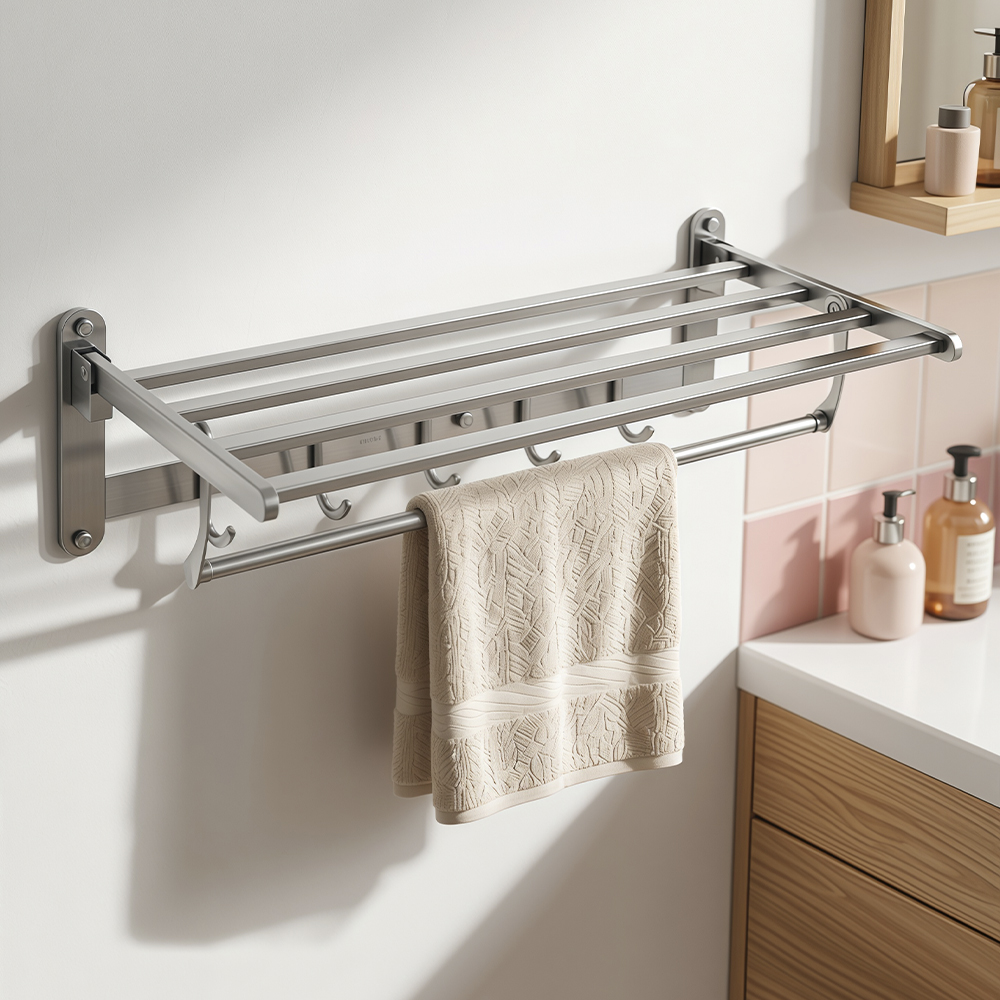 Полка для полотенца с опорой большая, для ванной, привлекает своим современным дизайном, многофункциональностью и надежностью конструкции. Откидывающаяся на 90° верхняя часть полки в ванную комнату позволяет размещать её даже в самых тесных помещениях. Кухня, ванная, прихожая, кладовка или гардеробная - эта полка идеально подойдет везде. Металлическая полка оснащена дополнительной перекладиной и крючками. Безупречно отшлифованная нержавеющая сталь делает её устойчивой к влаге и исключает появление ржавчины. Полка для ванной функциональное и практичное решение для любого интерьера. Материал изготовления — нержавеющая сталь 304. Матовое покрытие очень стойко переносит истирания . Идеально подойдет не только для ванной, но и для кухни. Изделие крепится к стене с помощью дюбелей и саморезов (входят в комплект). Габаритные размеры: ширина 600 мм, высота 170 мм, глубина 240 мм. Вес - 1.65 кг, объём - 0.0175 м3.