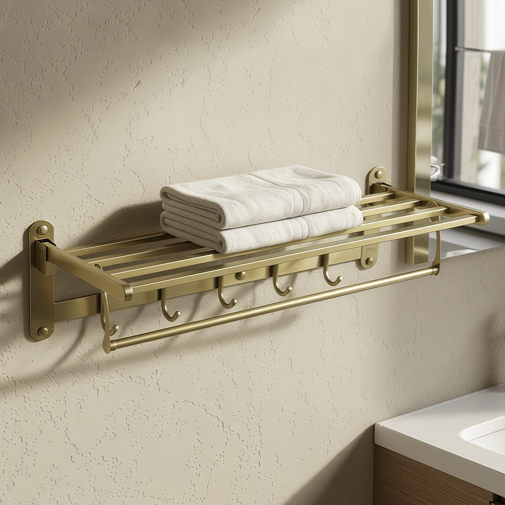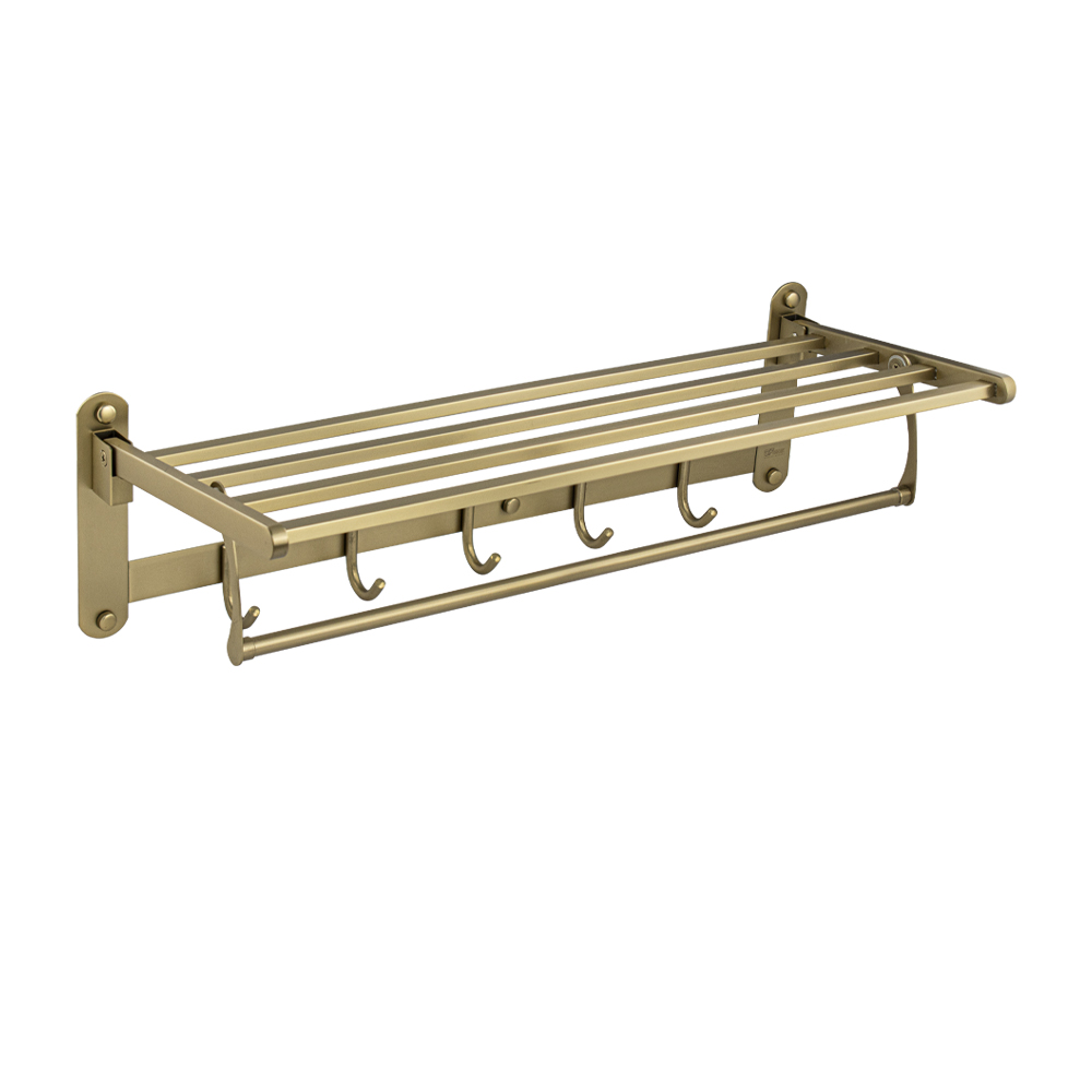 Полка для полотенца с опорой, большая, для ванной, привлекает своим современным дизайном, многофункциональностью и надежностью конструкции. Откидывающаяся на 90° верхняя часть полки в позволяет размещать её даже в самых тесных помещениях. Кухня, ванная, прихожая или гардеробная - эта полка идеально подойдет везде. Металлическая полка оснащена дополнительной перекладиной и крючками. Нержавеющая сталь делает её устойчивой к влаге и исключает появление ржавчины. Полка для ванной функциональное и практичное решение для любого интерьера. Материал изготовления — нержавеющая сталь. Матовое золотое покрытие очень стойко переносит истирания и обеспечивает безупречный вид изделия. Идеально подойдет не только для ванной, но и для кухни. Изделие крепится к стене с помощью дюбелей и саморезов (входят в комплект). Габаритные размеры: ширина 600 мм, высота 170 мм, глубина 240 мм. Вес - 1.73 кг, объём - 0.01623 м3.