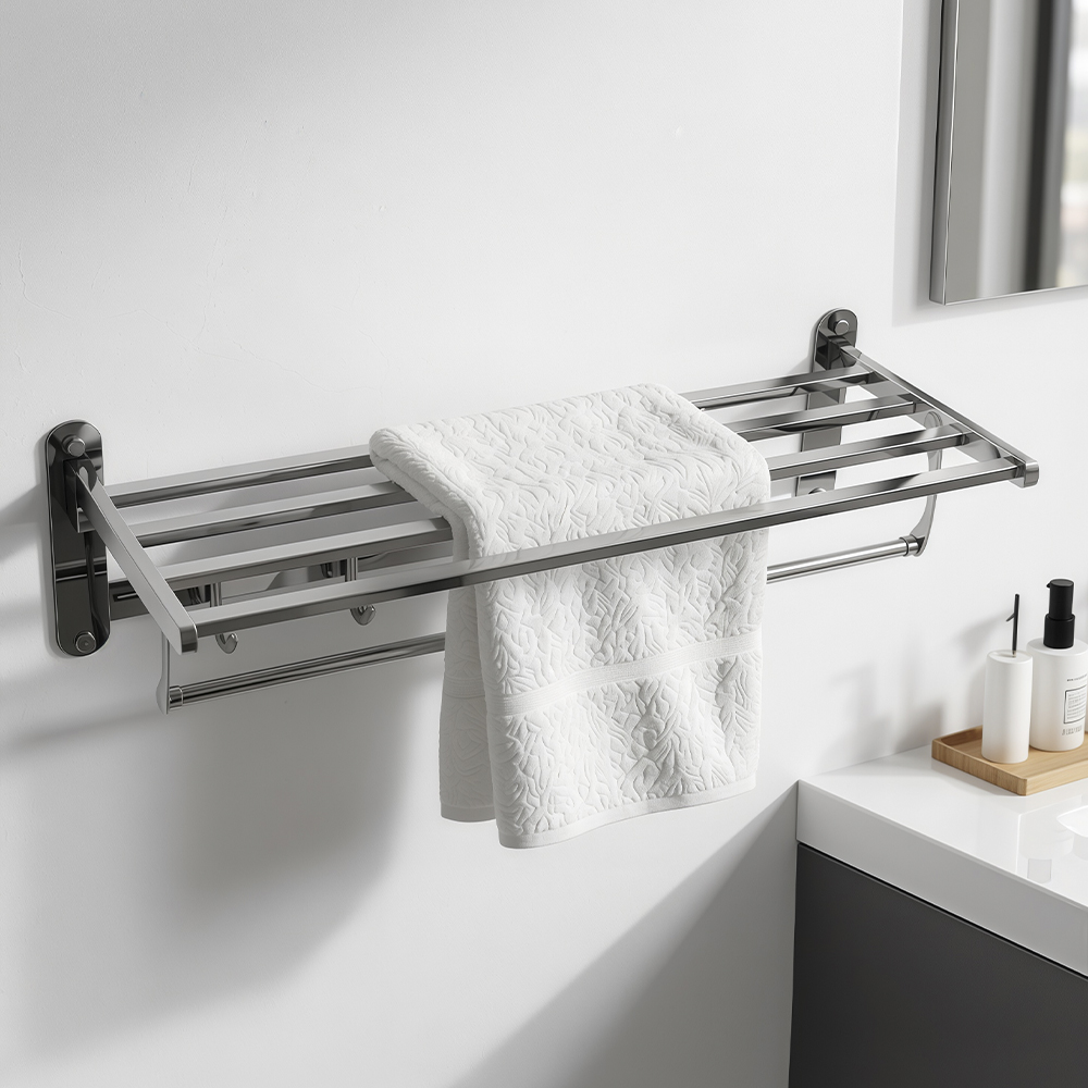Полка для полотенца с опорой, большая, для ванной, привлекает своим современным дизайном, многофункциональностью и надежностью конструкции. Откидывающаяся на 90° верхняя часть полки в позволяет размещать её даже в самых тесных помещениях. Кухня, ванная, прихожая или гардеробная - эта полка идеально подойдет везде. Металлическая полка оснащена дополнительной перекладиной и крючками. Нержавеющая сталь делает её устойчивой к влаге и исключает появление ржавчины. Полка для ванной функциональное и практичное решение для любого интерьера. Материал изготовления — нержавеющая сталь 304. Хромированное покрытие очень стойко переносит истирания и обеспечивает безупречный вид изделия. Идеально подойдет не только для ванной, но и для кухни. Изделие крепится к стене с помощью дюбелей и саморезов (входят в комплект). Габаритные размеры: ширина 600 мм, высота 170 мм, глубина 240 мм. Вес - 1.65 кг, объём - 0.0175 м3.