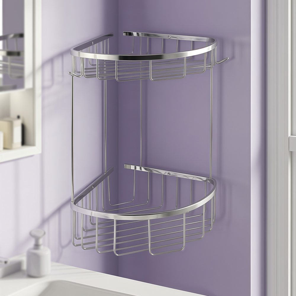 Полочка угловая, овальная, двухэтажная, для принадлежностей, решётка обладает высокими эксплуатационными характеристиками и подходит для использования дома, в общественных местах: отелях, ресторанах и пр. Изготовлена из прочной нержавеющей стали с хромоникелевым покрытием, которое придает безупречный глянцевый блеск и долговечность. Металлическая полка оснащена крючкоми. Аксессуар не занимает много места, надежно фиксируется к стене при помощи набора креплений (входят в комплект) и служит удобным местом для хранения бытовых и косметических средств. Габаритные размеры: высота 350 мм, ширина 250 мм, глубина 180 мм, расстояние между полками 220 мм, высота верхей полки 50 мм, высота нижней полки 80 мм. Вес - 1,0 кг, объём - 0,00990 м3.