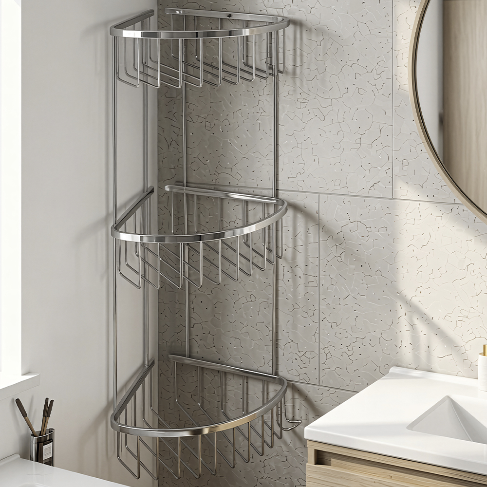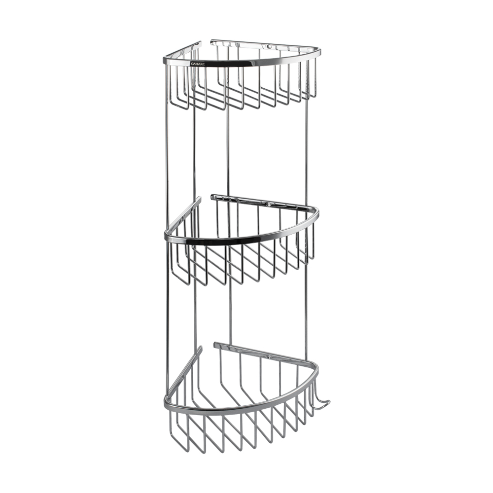 Полочка угловая, овальная, трёхэтажная, для принадлежностей, решётка обладает высокими эксплуатационными характеристиками и подходит для использования дома, в общественных местах: отелях, ресторанах и пр. Изготовлена из прочной нержавеющей стали с хромоникелевым покрытием, которое придает безупречный глянцевый блеск и долговечность. Металлическая полка оснащена крючком. Аксессуар не занимает много места, надежно фиксируется к стене при помощи набора креплений (входят в комплект) и служит удобным местом для хранения бытовых и косметических средств. Габаритные размеры: высота 560 мм, ширина 250 мм, глубина 180 мм, расстояние между полками 175 мм. Вес - 1,400 кг, объём - 0,02052 м3.