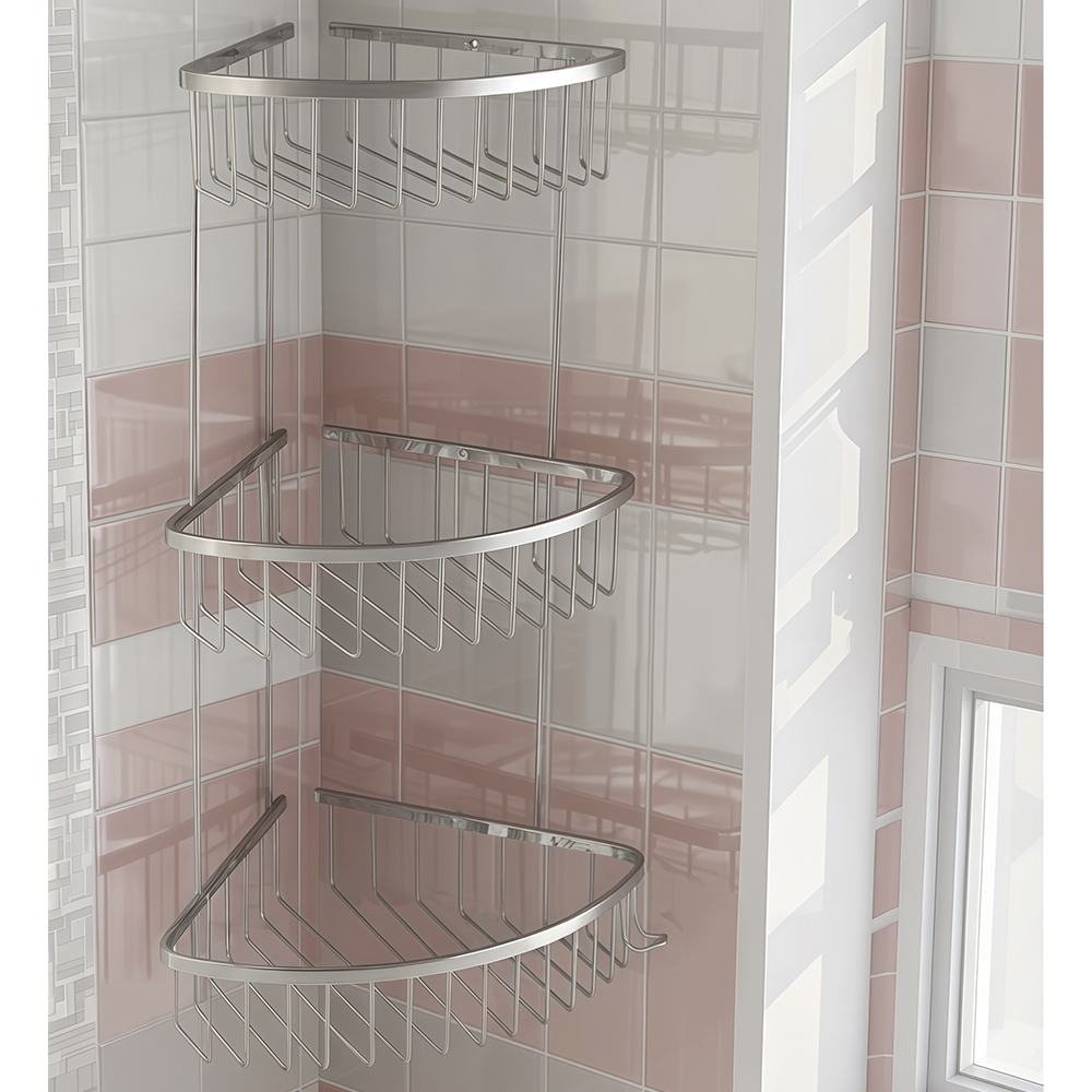 Полочка угловая, овальная, трёхэтажная, для принадлежностей, решётка обладает высокими эксплуатационными характеристиками и подходит для использования дома, в общественных местах: отелях, ресторанах и пр. Изготовлена из прочной нержавеющей стали с хромоникелевым покрытием, которое придает безупречный глянцевый блеск и долговечность. Металлическая полка оснащена крючком. Аксессуар не занимает много места, надежно фиксируется к стене при помощи набора креплений (входят в комплект) и служит удобным местом для хранения бытовых и косметических средств. Габаритные размеры: высота 560 мм, глубина верхней полки 180 мм, глубина средней полки 220 мм, глубина нижней полки 250 мм, расстояние между полками 175 мм. Вес - 1,700 кг, объём - 0,04500 м3.