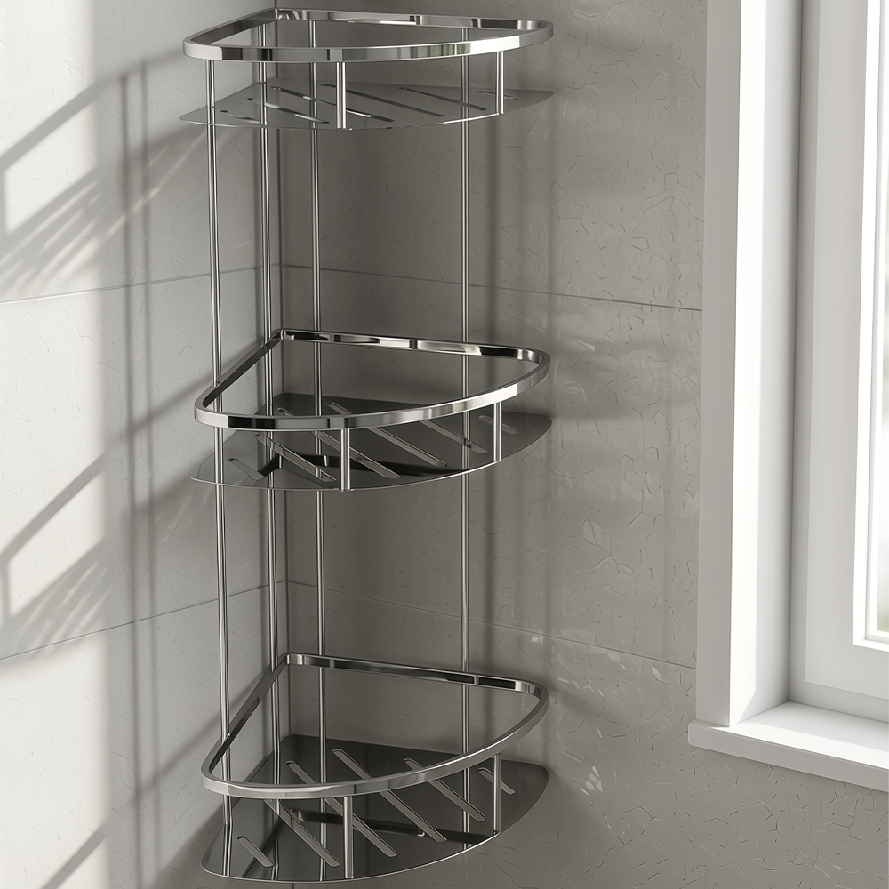 Полочка для принадлежностей закруглённая с литым дном трёхэтажная, обладает высокими эксплуатационными характеристиками и подходит для использования дома, в общественных местах: отелях, ресторанах и пр. Изготовлена из прочной нержавеющей стали с хромоникелевым покрытием, которое придает безупречный глянцевый блеск и долговечность. Аксессуар не занимают много места, надежно фиксируется к стене при помощи набора креплений (входят в комплект) и служит удобным местом для хранения бытовых и косметических средств. Габаритные размеры: длина стороны 220 мм, ширина 285 мм, расстояние между полками 240, общая высота 600 мм. Вес - 3,000 кг, объём - 0,03491 м3.