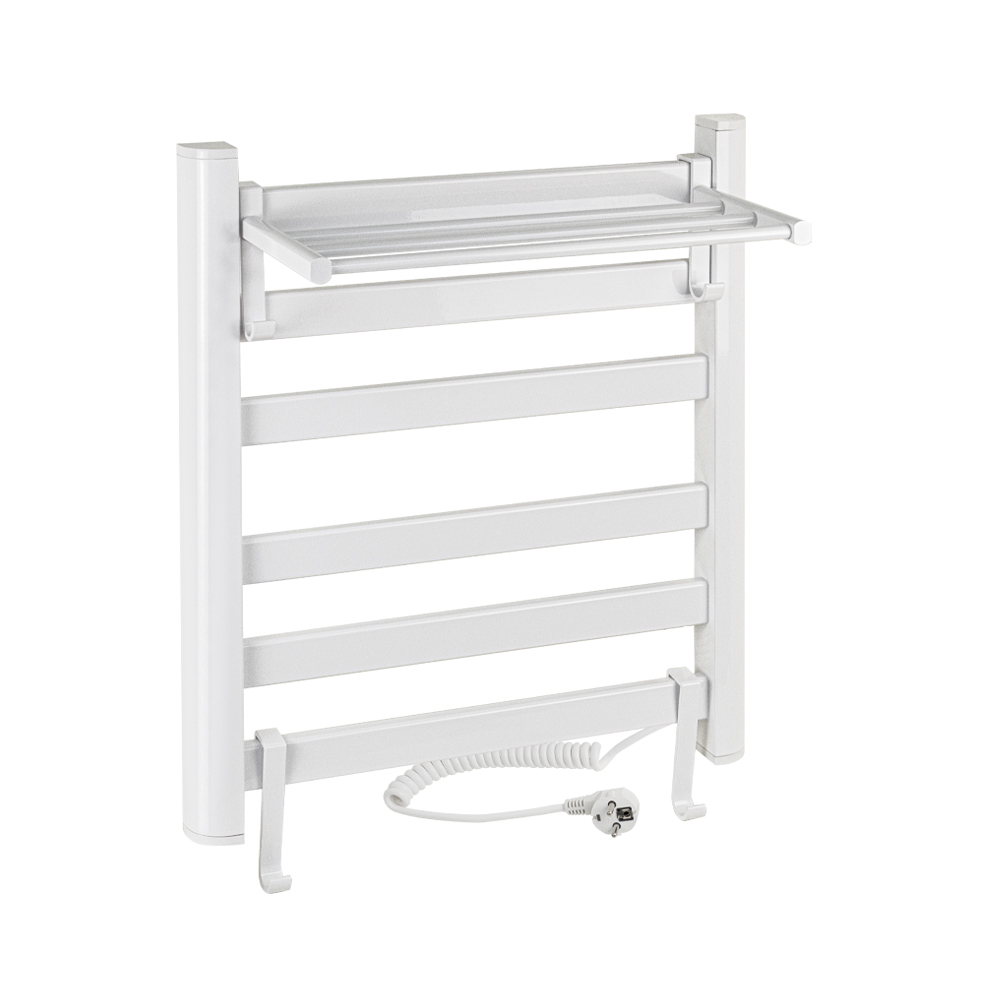 Полотенцесушитель электрический белый, лесенка с полкой и крючками, из алюминия, тэн из углеродного волокна гармонично впишется в современный интерьер и поможет поддержать комфортную атмосферу в ванной комнате, работает вне зависимости от отопительного сезона, и его можно разместить в любом месте ванной или даже на стене в комнате. Сверху нанесено белое полимерное покрытие, устойчивое к высоким температурам. Благодаря продуманному расположению труб можно размещать объемный текстиль, сократив время просушки. Установка и ремонт не требуют работы сантехников. Габаритные размеры: высота 600 мм, ширина 500 мм, полка 270 мм. 6 плоских перекладин, с сухим ТЭНом, 160 W, 220-230 V, 50-60 Гц, t - 55°С, IP 44. Комплект: полотенцесушитель, крепёж, провод с евровилкой для подключения. Вес - 4,500 кг, объём - 0,03800 м3.