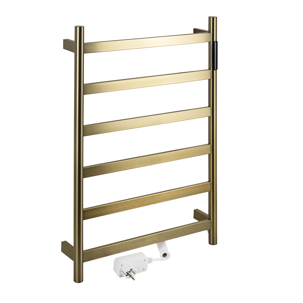 Полотенцесушитель электрический, цвет матовое золото, лесенка, из нержавеющей стали, сенсорное управление с таймером до 24 часов, регулировка температуры от 35°С до 70°С, тэн из углеродного волокна, гармонично впишется в современный интерьер и поможет поддержать комфортную атмосферу в ванной комнате, работает вне зависимости от отопительного сезона, и его можно разместить в любом месте ванной или даже на стене в комнате. ПВД покрытие матовое золото, устойчивое к высоким температурам. Благодаря продуманному расположению труб можно размещать объемный текстиль, сократив время просушки. Установка и ремонт не требуют работы сантехников. Габаритные размеры: ширина 480 мм, высота 730 мм, глубина 90 мм. 6 перекладин, с сухим ТЭНом, 75 Вт, 220-230 В, 50-60 Гц, t 55°С, IP 44. Комплект: полотенцесушитель, крепёж, провод с евровилкой для подключения. Вес - 4,000 кг, объём - 0,06 м3.
