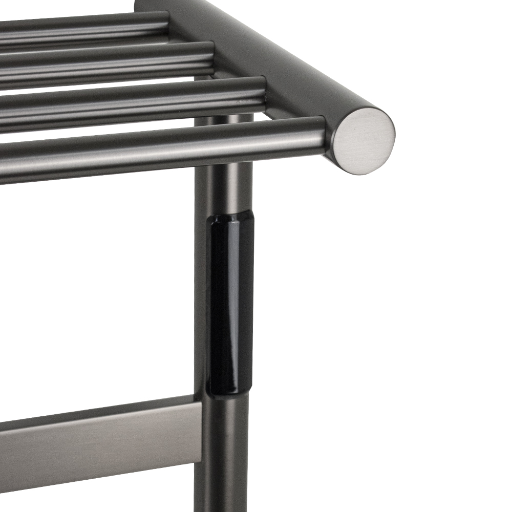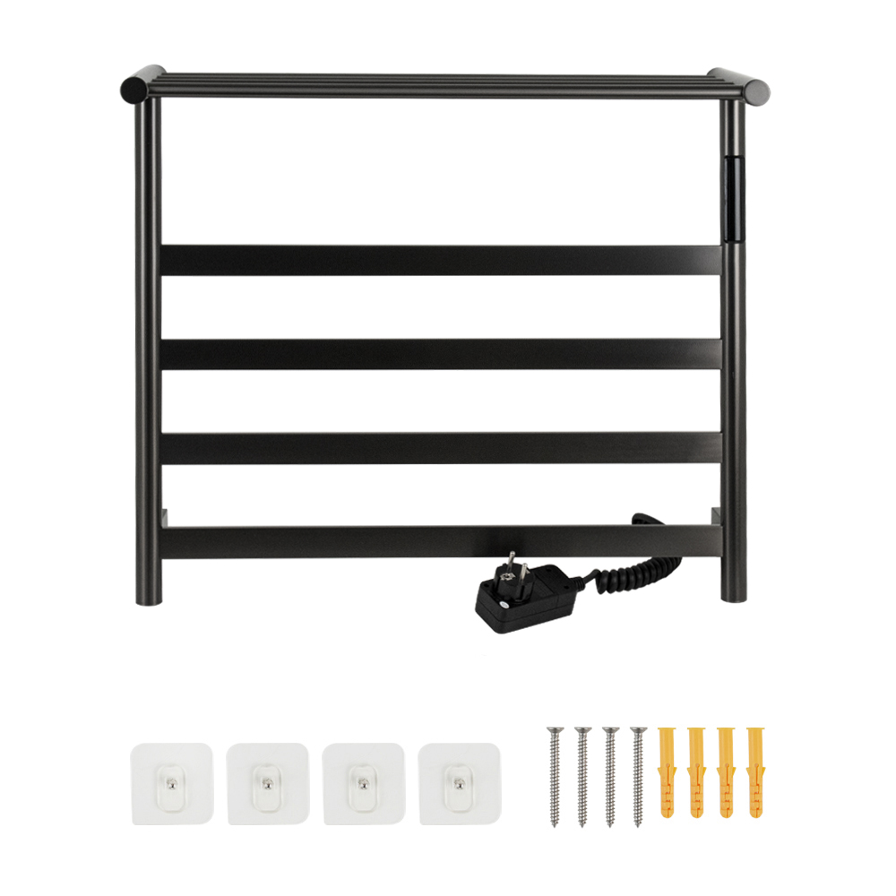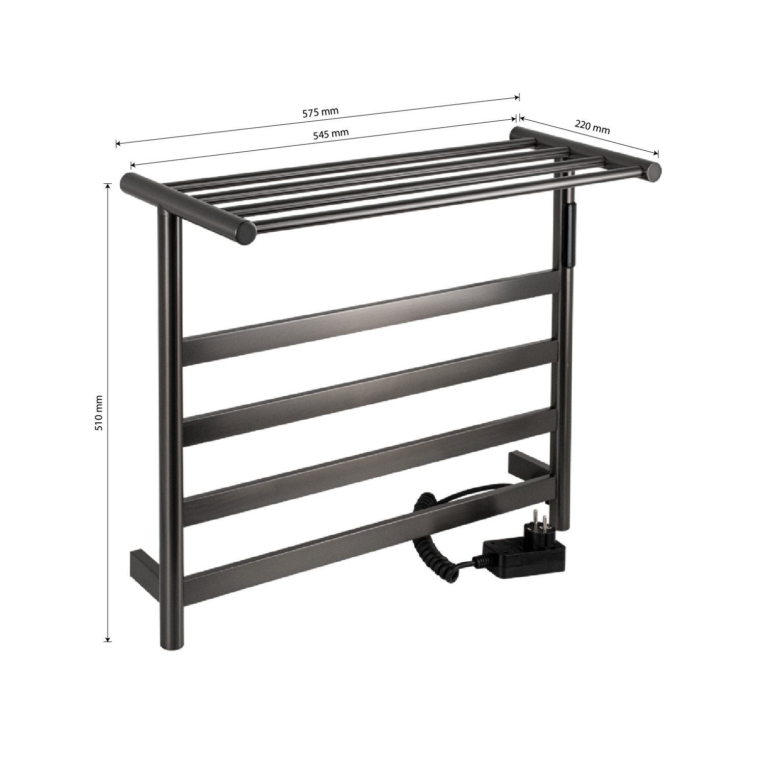 Полотенцесушитель электрический, цвет графит, лесенка с полкой, из нержавеющей стали, сенсорное управление с таймером до 24 часов, регулировка температуры от 40°С до 60°С, тэн из углеродного волокна гармонично впишется в современный интерьер и поможет поддержать комфортную атмосферу в ванной комнате, работает вне зависимости от отопительного сезона, и его можно разместить в любом месте ванной или даже на стене в комнате. PVD покрытие цвета графит, устойчивое к высоким температурам. Благодаря продуманному расположению труб можно размещать объемный текстиль, сократив время просушки. Установка и ремонт не требуют работы сантехников. Запуск - нажатием одной кнопки. Габаритные размеры: высота 510 мм, ширина 575 мм, полка 220 мм. 4 перекладины, с сухим ТЭНом, 75 W, 220-230 V, 50-60 Гц, t - 55°С, IP 44. Комплект: полотенцесушитель, крепёж, провод с евровилкой для подключения. Вес - 4,200 кг, объём - 0,05000 м3.