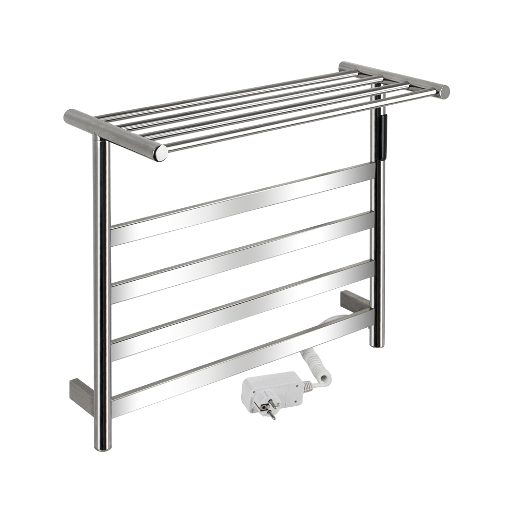 Полотенцесушитель электрический, цвет хром, лесенка с полкой, из нержавеющей стали марки 304, сенсорное управление, с таймером до 24 часов, регулировка температуры от 35°С до 70°С, тэн из углеродного волокна, гармонично впишется в современный интерьер и поможет поддержать комфортную атмосферу в ванной комнате, работает вне зависимости от отопительного сезона, и его можно разместить в любом месте ванной или даже на стене в комнате. Хромированная поверхность устойчива к высоким температурам. Благодаря продуманному расположению труб можно размещать объемный текстиль, сократив время просушки. Установка и ремонт не требуют работы сантехников. Габариты и параметры: высота 510 мм, ширина 575 мм, полка 220 мм. 4 перекладины, с сухим ТЭНом, 75 Вт, 220-230 В, 50-60 Гц, t - 55°С, IP 44. Комплект: полотенцесушитель, крепёж, провод с евровилкой для подключения. Вес - 4,200 кг, объём - 0,05000 м3.