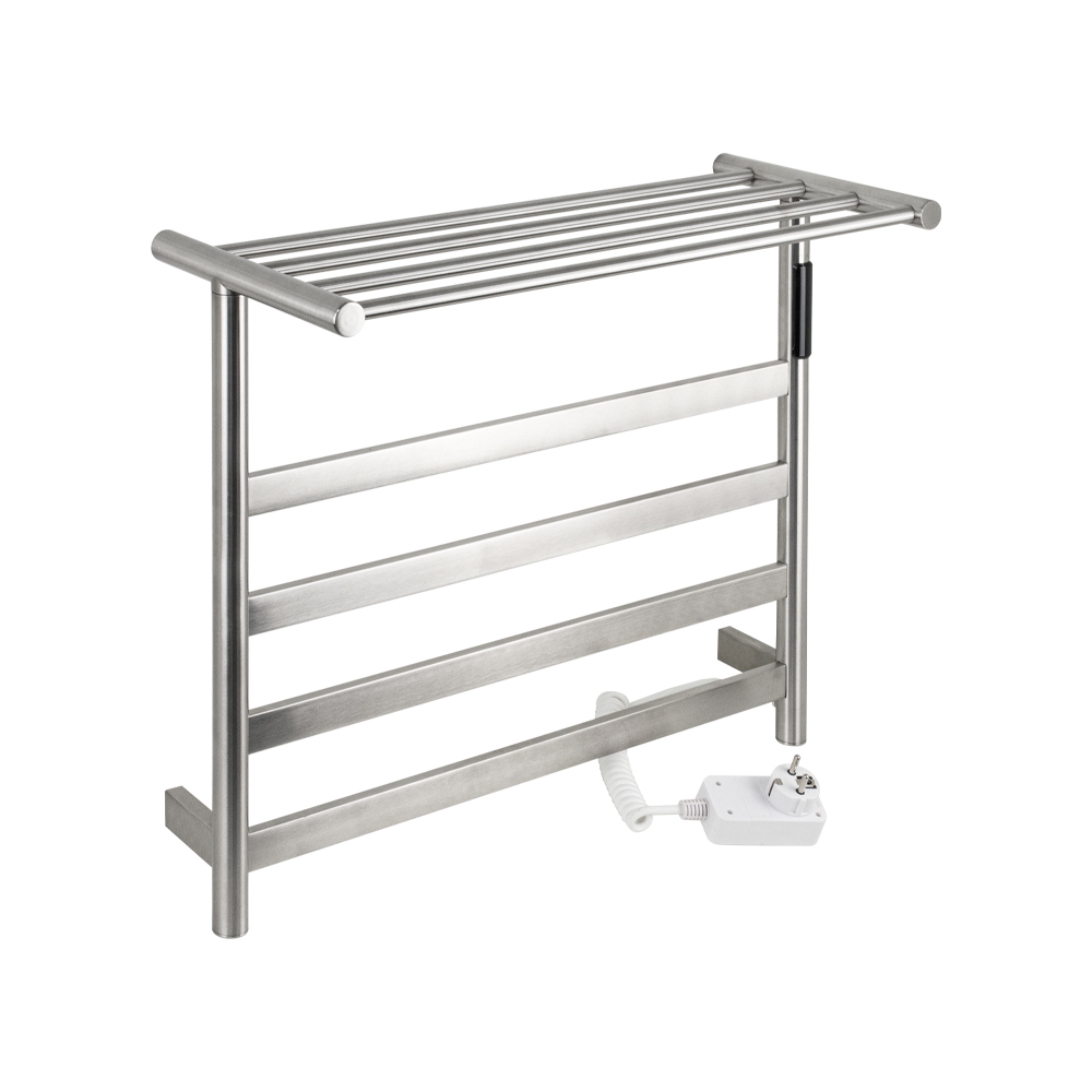 Полотенцесушитель электрический, цвет сатин, лесенка с полкой, из нержавеющей стали, сенсорное управление с таймером до 24 часов, регулировка температуры от 40°С до 60°С, тэн из углеродного волокна гармонично впишется в современный интерьер и поможет поддержать комфортную атмосферу в ванной комнате, работает вне зависимости от отопительного сезона, и его можно разместить в любом месте ванной или даже на стене в комнате. ПВД покрытие цвета графит, устойчивое к высоким температурам. Благодаря продуманному расположению труб можно размещать объемный текстиль, сократив время просушки. Установка и ремонт не требуют работы сантехников. Запуск - нажатием одной кнопки. Габаритные размеры: высота 510 мм, ширина 575 мм, полка 220 мм. 4 перекладины, с сухим ТЭНом, 75 Вт, 220-230 В, 50-60 Гц, t - 55°С, IP 44. Комплект: полотенцесушитель, крепёж, провод с евровилкой для подключения. Вес - 4,200 кг, объём - 0,05000 м3.