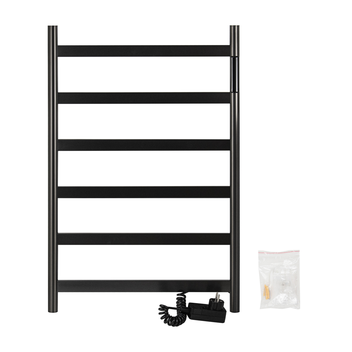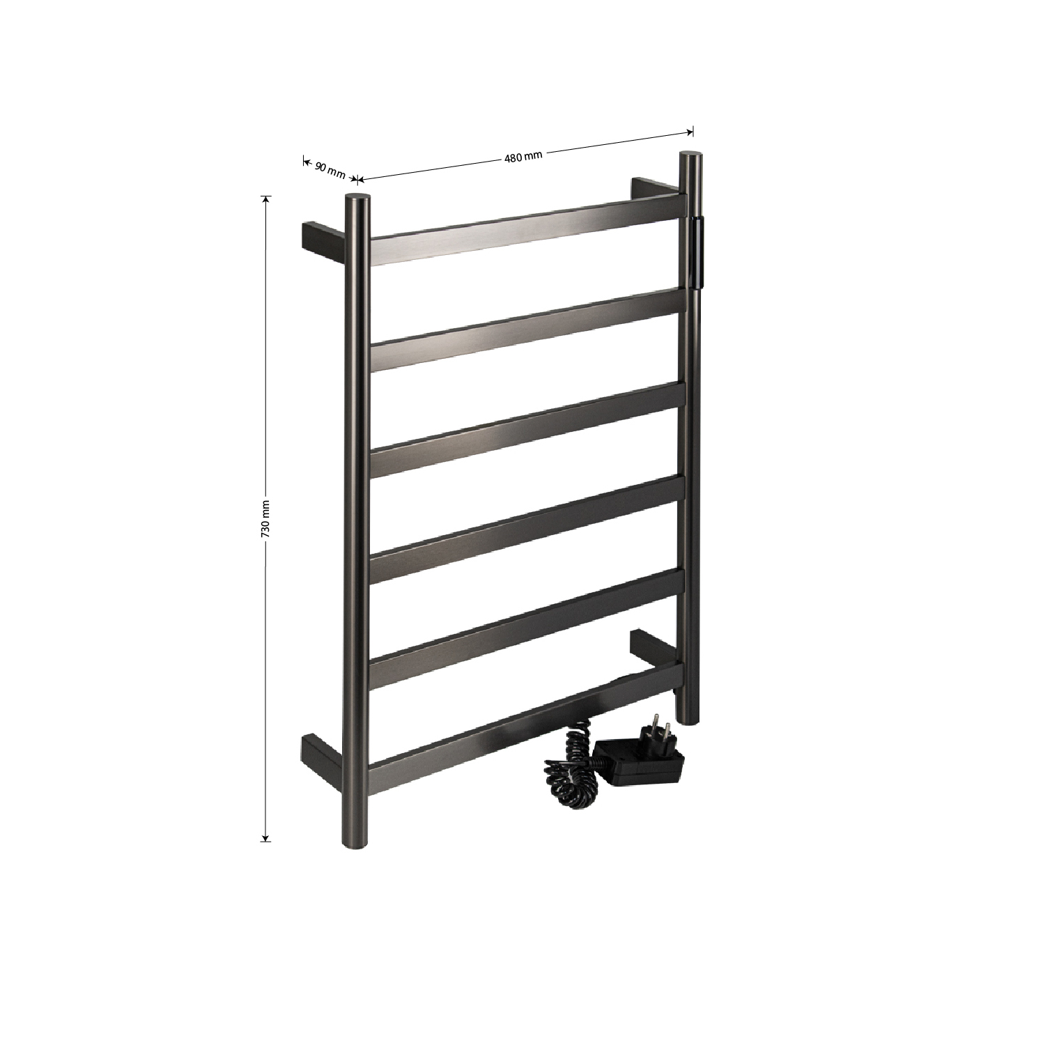 Полотенцесушитель электрический, цвет ГРАФИТ, лесенка из нержавеющей стали марки 304, с таймером до 24 часов, регулировка температуры от 35°С до 70°С, тэн из углеродного волокна, гармонично впишется в современный интерьер и поможет поддержать комфортную атмосферу в ванной комнате, работает вне зависимости от отопительного сезона, и его можно разместить в любом месте ванной или даже на стене в комнате. Матовая поверхность устойчива к высоким температурам. Благодаря продуманному расположению труб можно размещать объемный текстиль, сократив время просушки. Установка и ремонт не требуют работы сантехников. Габариты и параметры: ширина 480 мм, высота 730 мм, глубина 90 мм. 6 перекладин, с сухим ТЭНом, 75 W, 220-230 V, 50-60 Гц, t - 55°С, IP 44. Комплект: полотенцесушитель, крепёж, провод с евровилкой для подключения. Вес - 3,86 кг, объём - 0,055 м3
