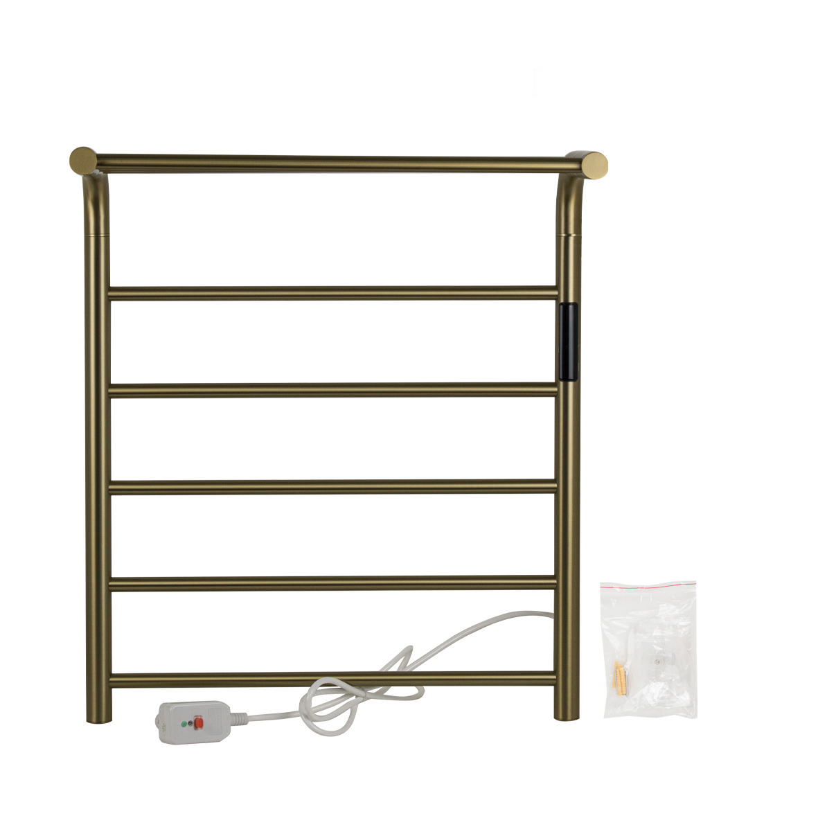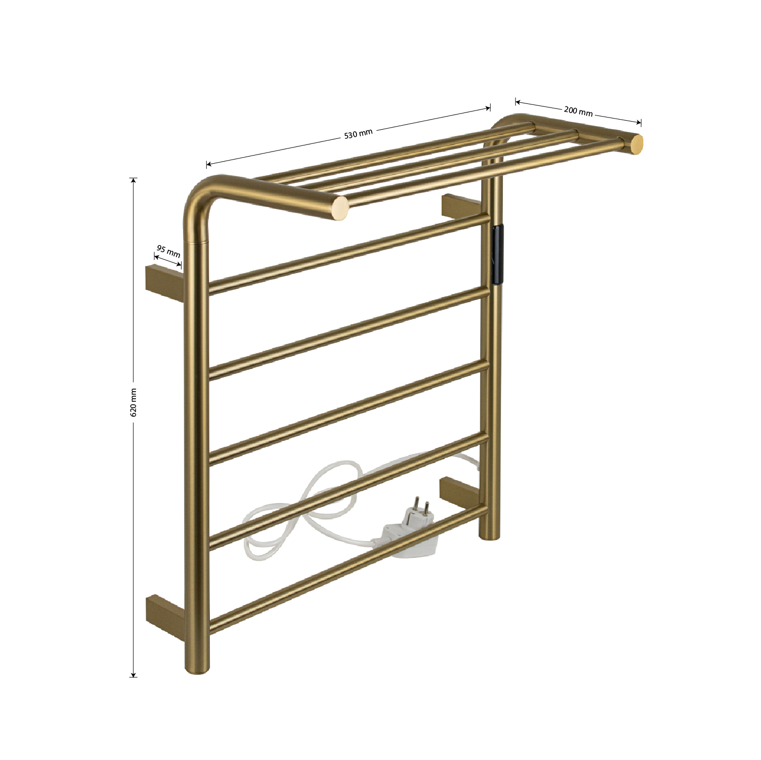 Полотенцесушитель электрический, лесенка с полкой, из нержавеющей стали марки 304, с сенсорным управлением, с таймером до 24 часов, регулировка температуры от 35°С до 70°С, тэн из углеродного волокна, гармонично впишется в современный интерьер и поможет поддержать комфортную атмосферу в ванной комнате, работает вне зависимости от отопительного сезона, и его можно разместить в любом месте ванной или даже на стене в комнате. Матовая поверхность устойчива к высоким температурам. Благодаря продуманному расположению труб можно размещать объемный текстиль, сократив время просушки. Установка и ремонт не требуют работы сантехников. Габариты и параметры: высота 620 мм, ширина 530 мм, полка 295 мм, длина крепления к стене 95 мм. 5 перекладин, с сухим ТЭНом, W, 220-230 V, 50-60 Гц, t - 35-70°С, IP 44. Комплект: полотенцесушитель, крепёж, провод с евровилкой для подключения. Вес - 4 кг, объём - 0,04709 м3.