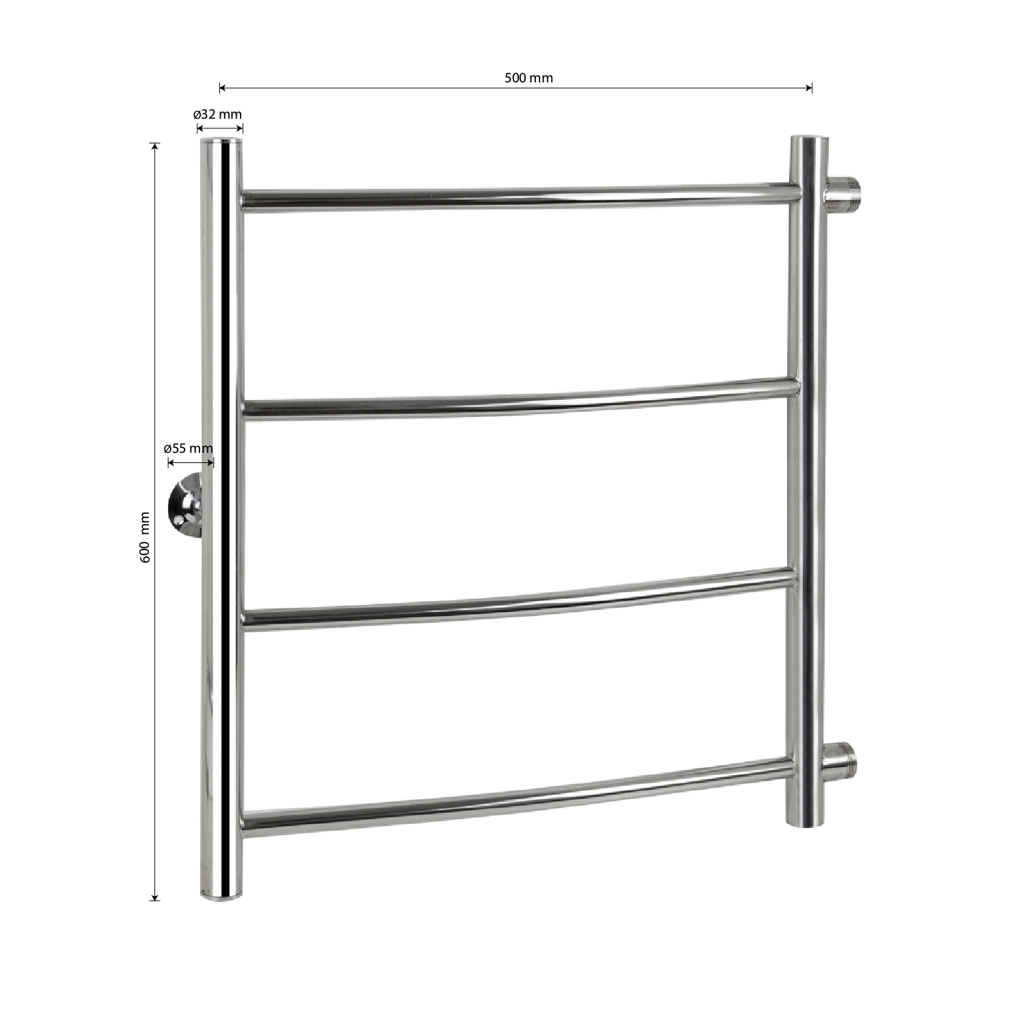 Водяной полотенцесушитель, хромированный, лесенка - дуга с боковым подключением м/осевое - 500 мм, изготовлен из высокопрочной нержавеющей стали. Металл устойчив к коррозии и деформации, отлично выдерживает перепады температуры и давления в системе водоснабжения. После установки полотенцесушителя в помещении становится значительно комфортнее: уменьшается влажность, исчезает конденсат, снижается риск появления плесени. Изделие не только поддержит комфортную температуру в санузле, но и быстро просушит белье. Подключение 1". Подключается к системе горячего водоснабжения, функционирует круглый год. Габаритные размеры: высота 600 мм, ширина 500 мм, диаметр трубы 32 мм, толщина 2 мм. Комплект : полотенцесушитель, 1 крепление, кран Маевского поможет удалить воздух из системы, декоративные заглушки. Вес - 3,300 кг, объём - 0,01500 м3.