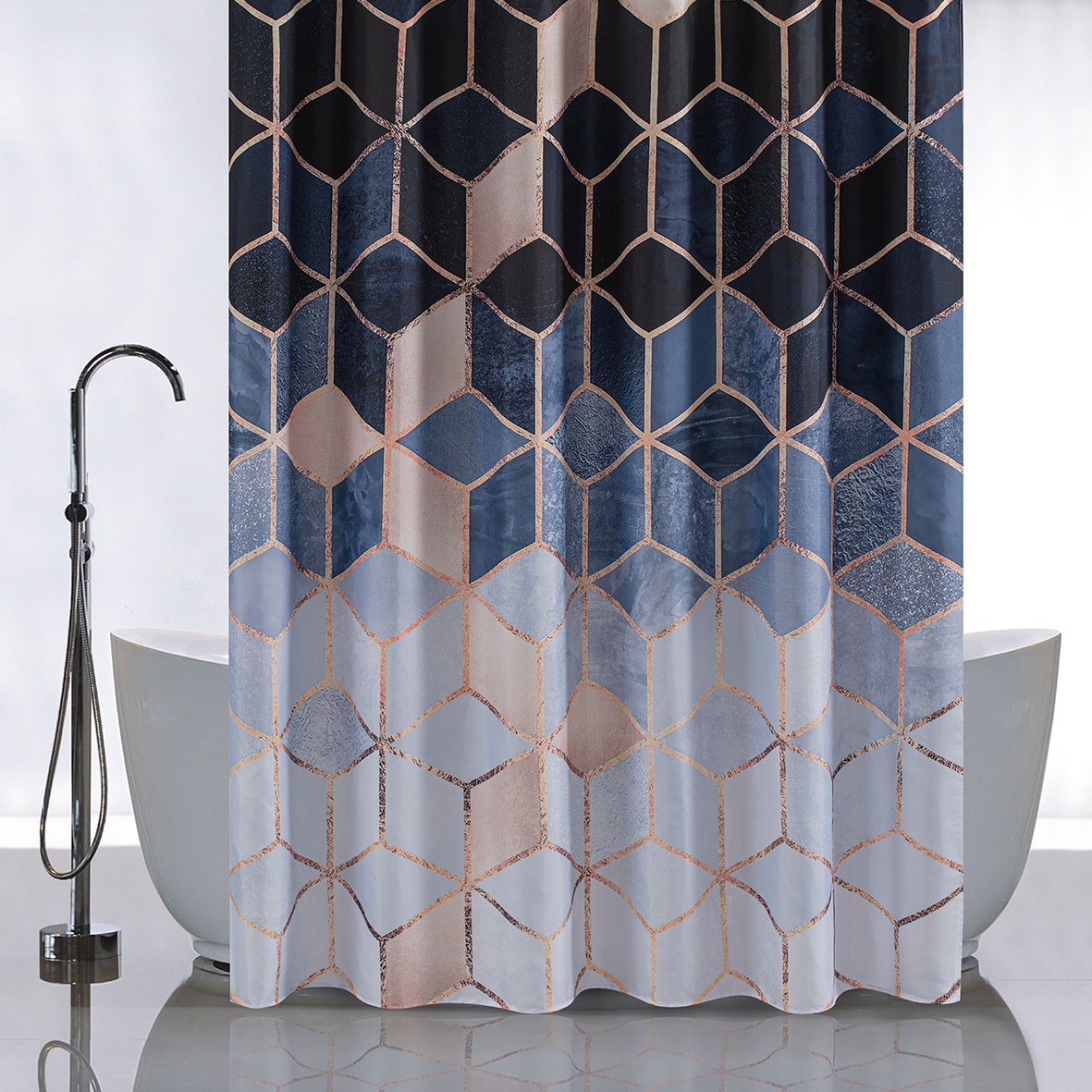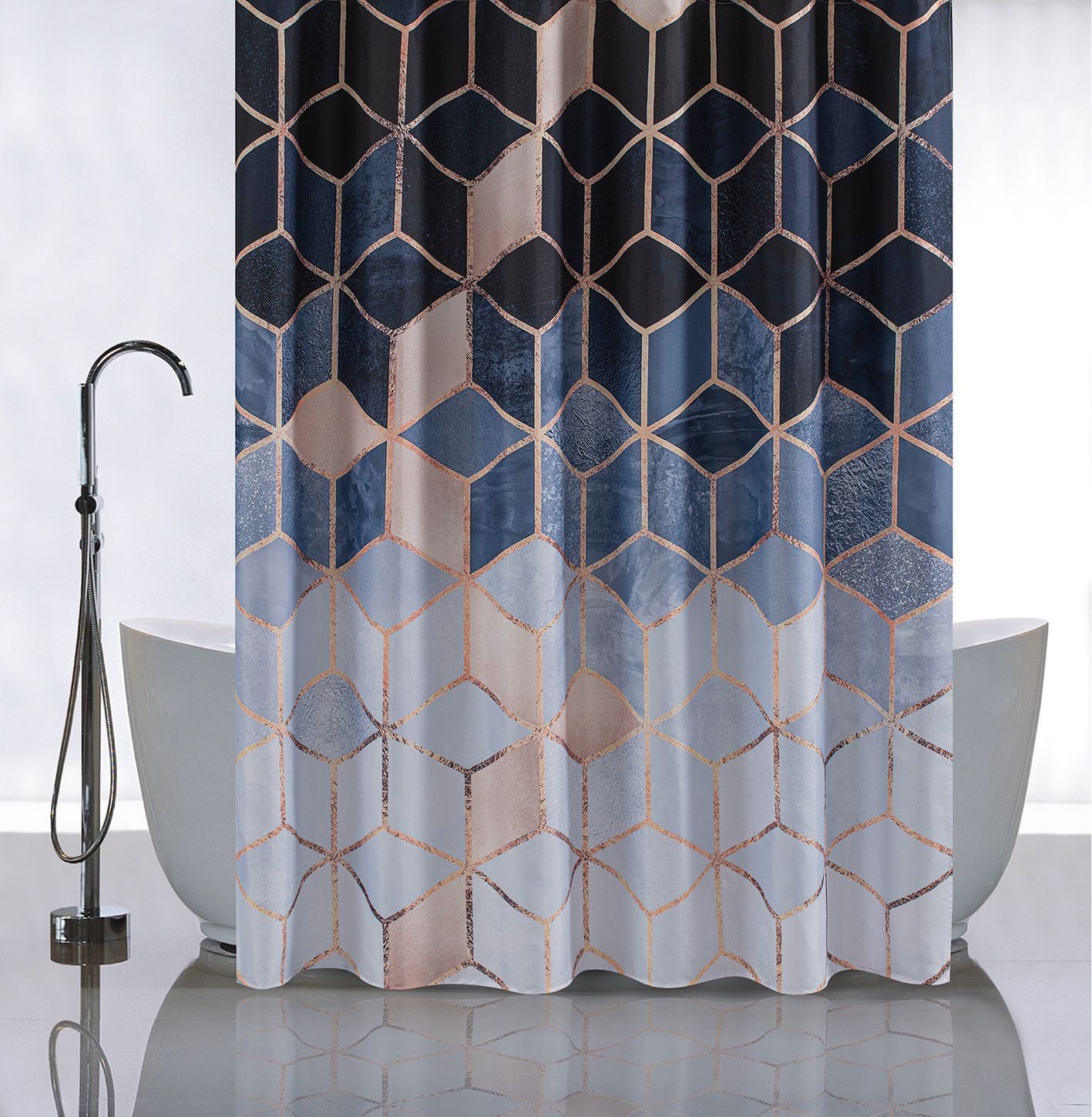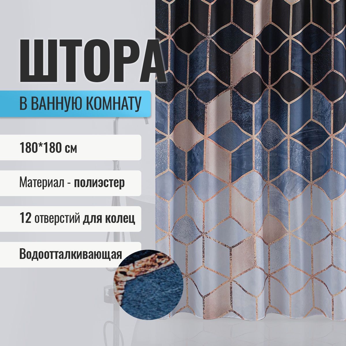 Штора с рисунком синие КУБЫ, в ванную комнату, без колец - полиэстэр