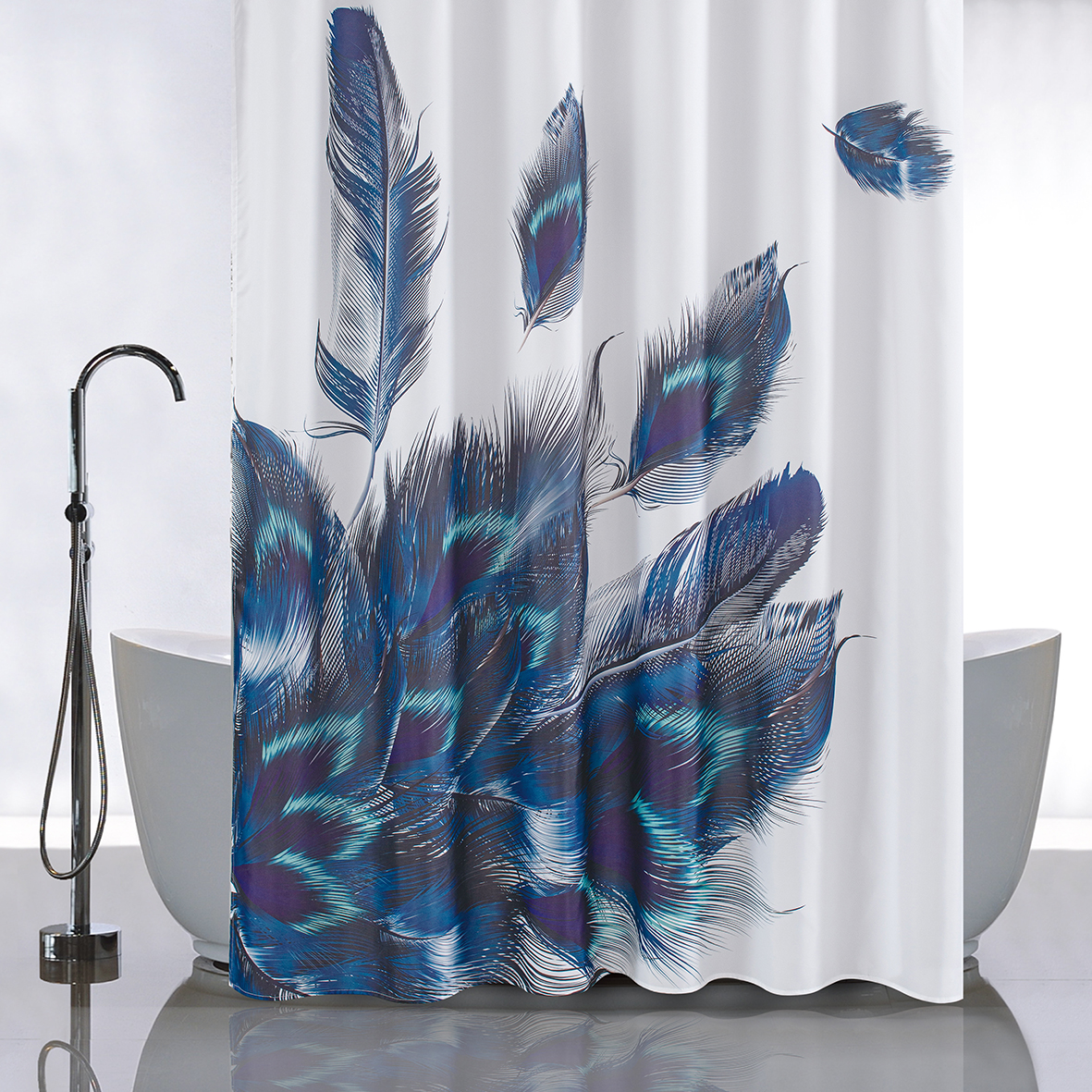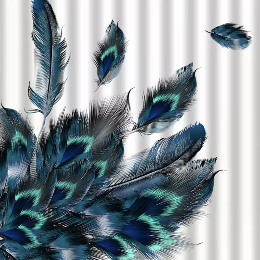 Штора с рисунком синие перья, в ванную комнату, без колец - полиэстэр