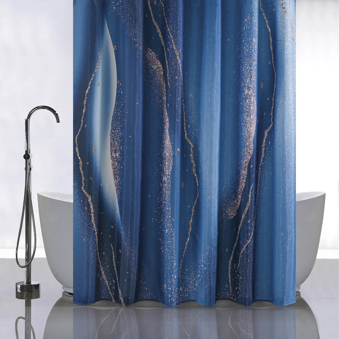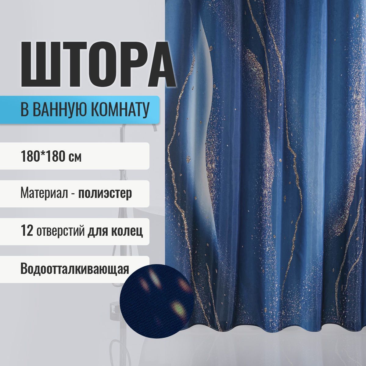 Штора с рисунком ГОЛУБОЙ МРАМОР с ЗОЛОТОМ, в ванную комнату, без колец - полиэстэр, 180 х 180 см.